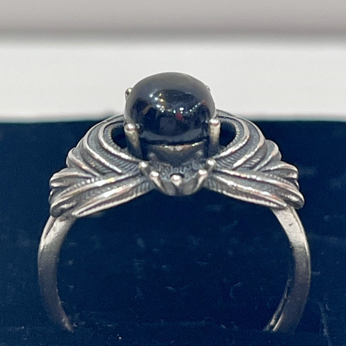 The deep black cabochon at the heart of this ring