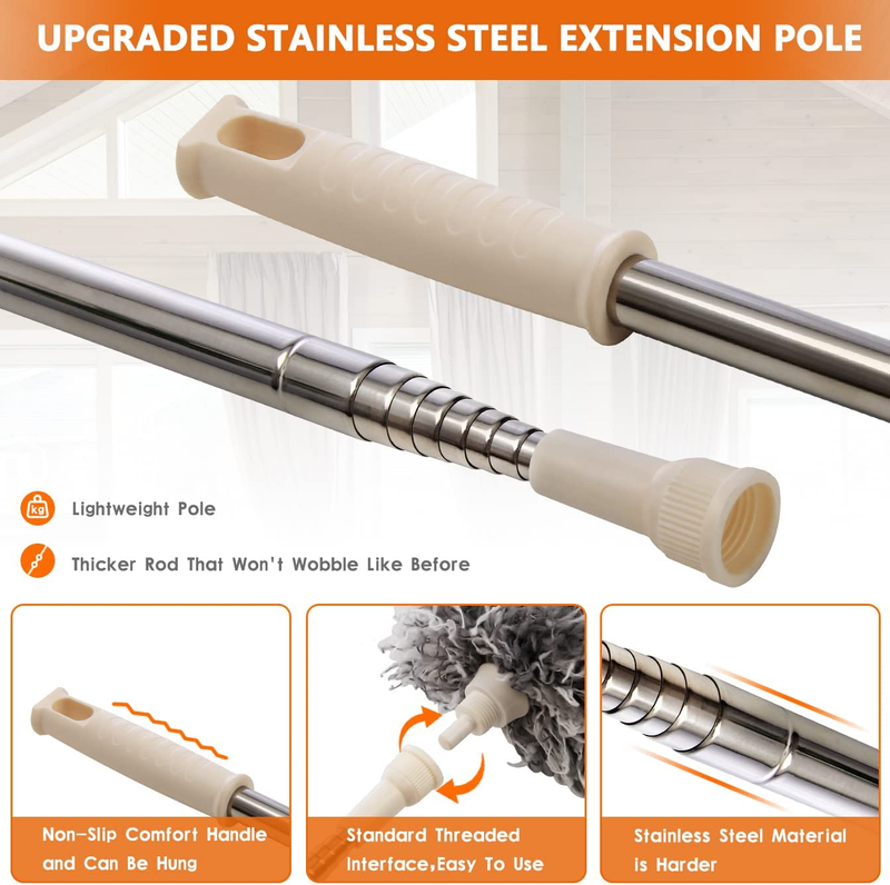 ?DUSTERS FOR CLEAN EFFECTIVELY - There won?t be trouble any more when you need to clean the high ceiling fan, our microfiber duster cleaner with new design stainless steel extension pole, does not rust, rotary thread reinforcement clamping, not easy to shake.