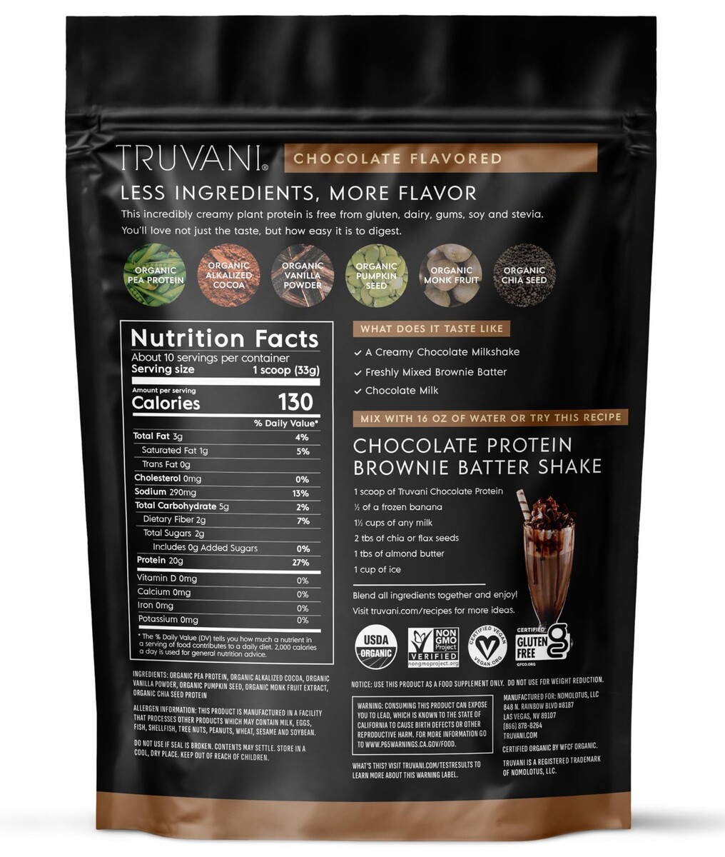 Expiration Date of 7/2027 ? Premium, Hand-Selected Ingredients: Elevate your health with Truvani plant-protein powder, crafted with pr emium ingredients to support a clean and vibrant lifestyle. Indulge guilt-free in a variety of decadent flavors, all made with vegan ingredients. Truvani is ideal for those with dietary restrictions or sensitivities, promoting digestive wellness. ? Clean Formula, Free of Additives Fillers: Experience pure nutrition with Truvani plant-based protein powder, free from artificial sweeteners, useless additives, and weird fillers. Our formula excludes soy, wheat, dairy, gluten, and stevia, ensuring a clean and wholesome blend. Enjoy the sweetness of organic monk fruit without added sugars. ? Certified USDA Organic: Trust in the integrity of our plant-based vegan protein powder, certified USDA Organic, non-GMO, and vegan-friendly. Our straightforward label and simple ingredients ensure transparency and quality. Protein sourced from all organic pea, pumpkin seed, and chia seed. ? Truvani's Commitment to Quality: Truvani supports ethical and sustainable dietary choices while meeting strict quality standards. Our protein is also gluten free and keto friendly for a holistic dietary supplement. A protein that can work for an array of diets without sacrificing flavor or quality. ? Delicious Vegan Protein Shake: Elevate your daily routine with a delicious protein boost from Truvani plant protein powder. Our smooth blend delivers rich flavors without a chalky or grainy texture, making every sip enjoyable. Each serving has 120-140 calories to help you hit your fitness goals.