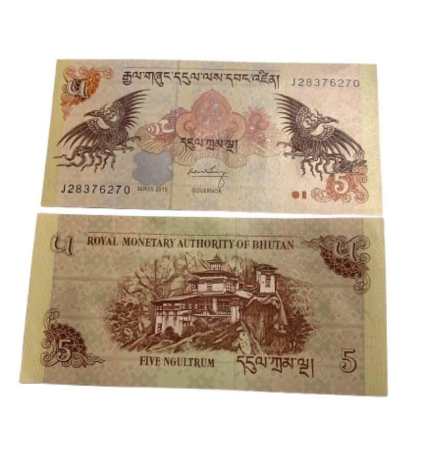 This listing features an UNC Bhutan 5 Ngultrum banknote, Series 2015, with vibrant designs including mythical birds and the iconic monastery on the reverse.