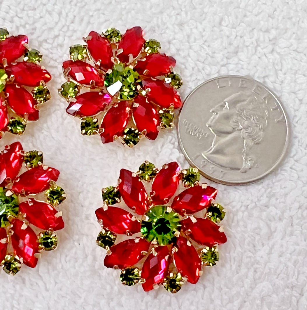 4 Watermelon Pink Avocado Green Rhinestone Buttons 1" Flower Shaped Buttons we have no idea if these are set in metal or a type of hard plastic, but the colors are stunning!! no missing stones