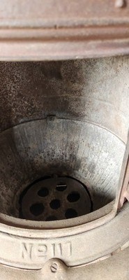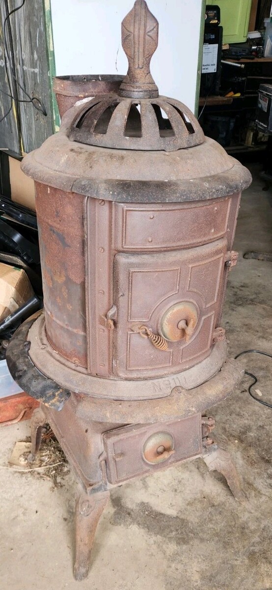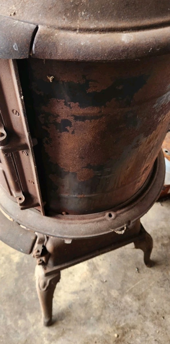 Antique wood pot belly stove. May be able to burn coal as well. Jacobs MFG. #117. One side bottom skirt piece is not attached and looks like it may be missing a couple others. Has wear to the sides where logs hit when it is hot. Nice top still there. These are misplaced a lot of times. Is approx 4 foot tall. Local pick up is an option to save on shipping. Message with zip code for a freight quote.