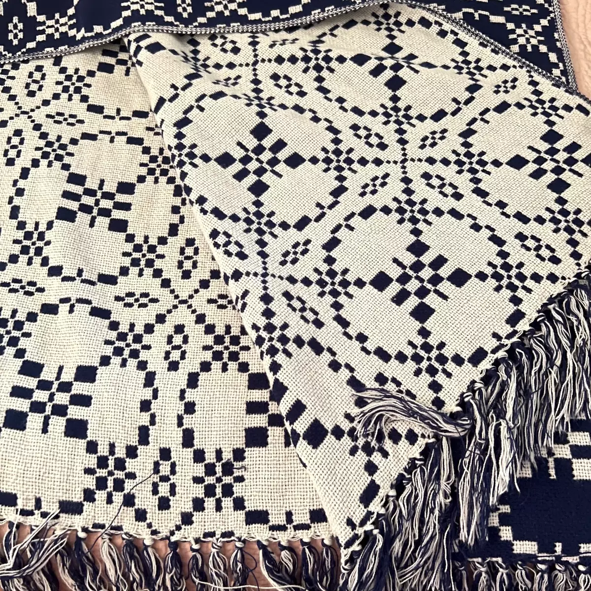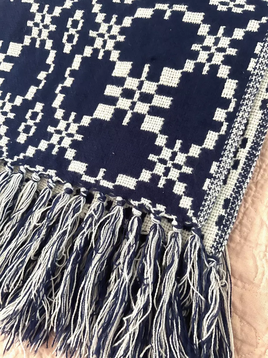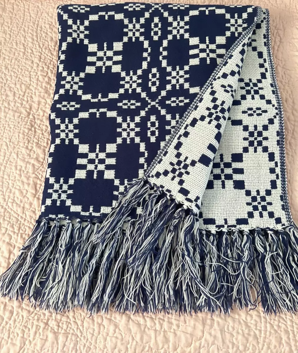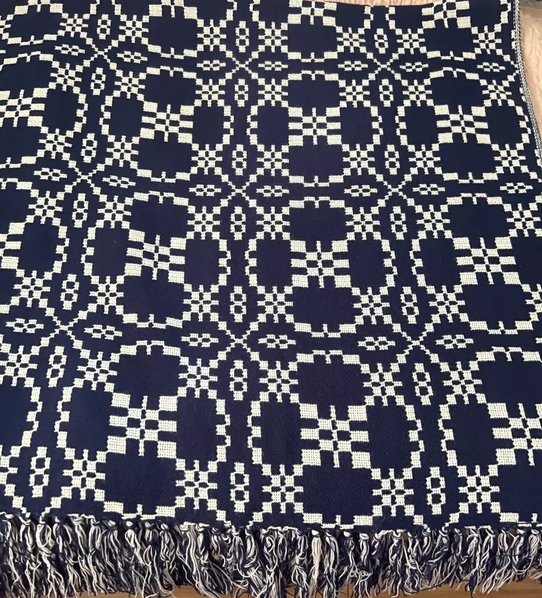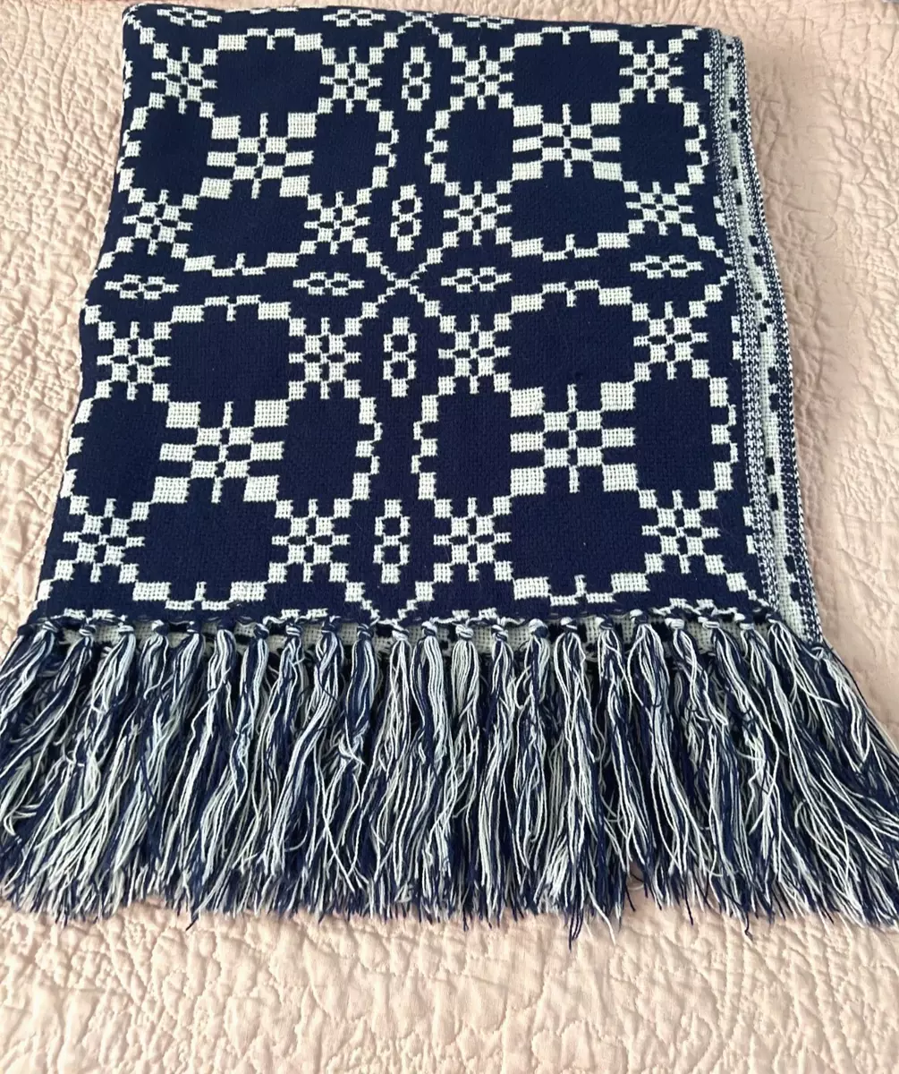 Handcrafted Overshot Lovers Knot Woven Navy Fringed Throw Blanket