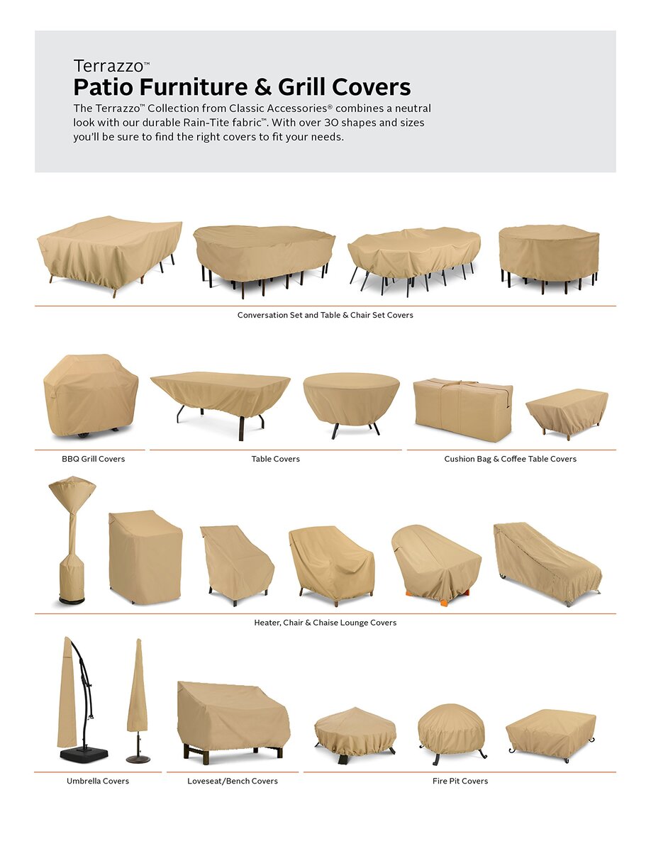 Product description: Terrazzo Patio furniture covers by Classic Accessories offer high-end style in medium weight protection. Designed to keep your patio furniture looking it?s best year round. All Terrazzo covers are backed by a one year warranty. When you buy a Classic Accessories grill or patio furniture cover you are not just getting a cover; you?re also purchasing peace of mind. Not only will your grill and patio furniture be protected from the elements, but you?ll be protected with the easiest warranty in the industry. If your cover fails, for any reason, just look for us online and email our warranty department a picture of the problem and we?ll send you a new one. Guaranteed.