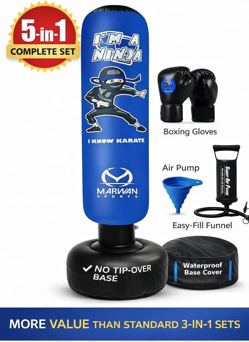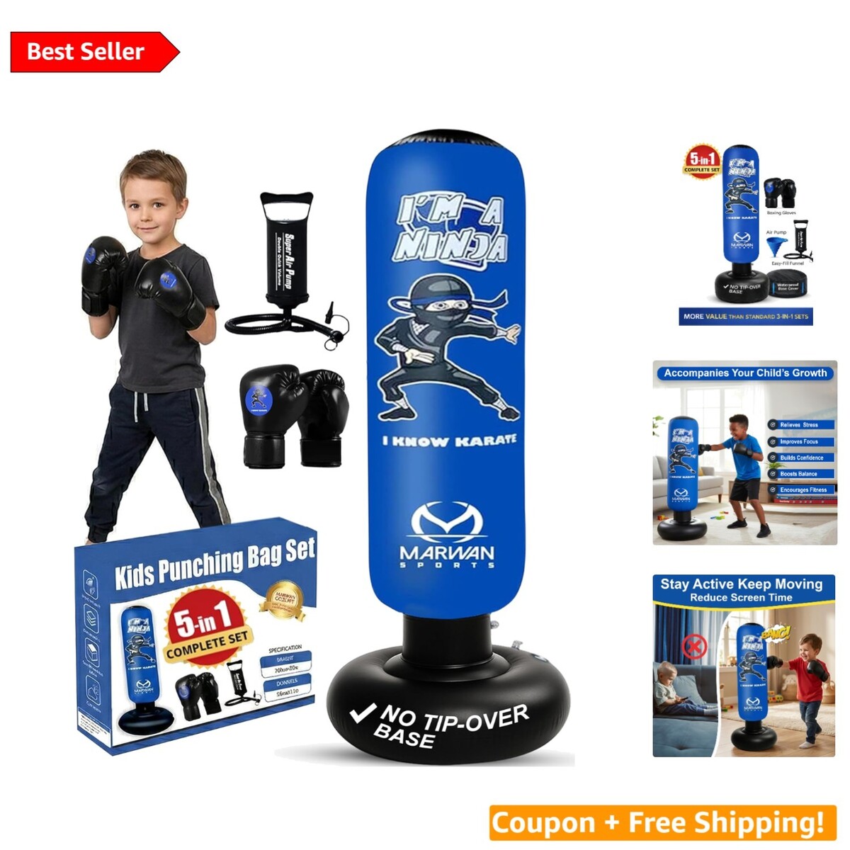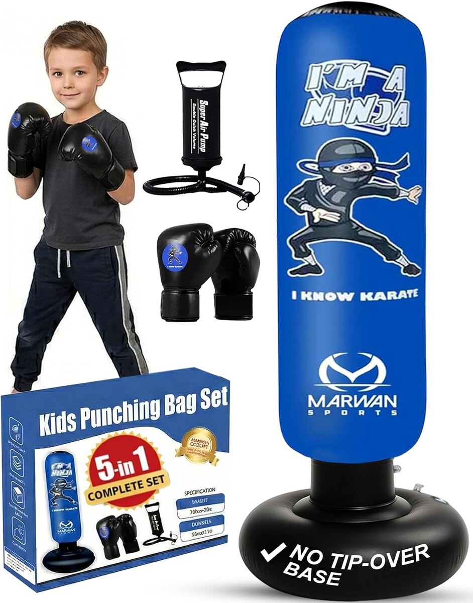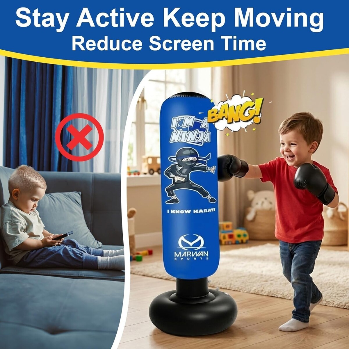 ? COMPLETE KIDS BOXING SET WITH GLOVES ? This ultimate boxing set includes everything your child needs for training and play: a 63" inflatable punching bag, 6oz boxing gloves, an air pump, and a base cover. Designed for children ages 4-12, it's perfect for karate training, kickboxing, and energetic martial arts fun.