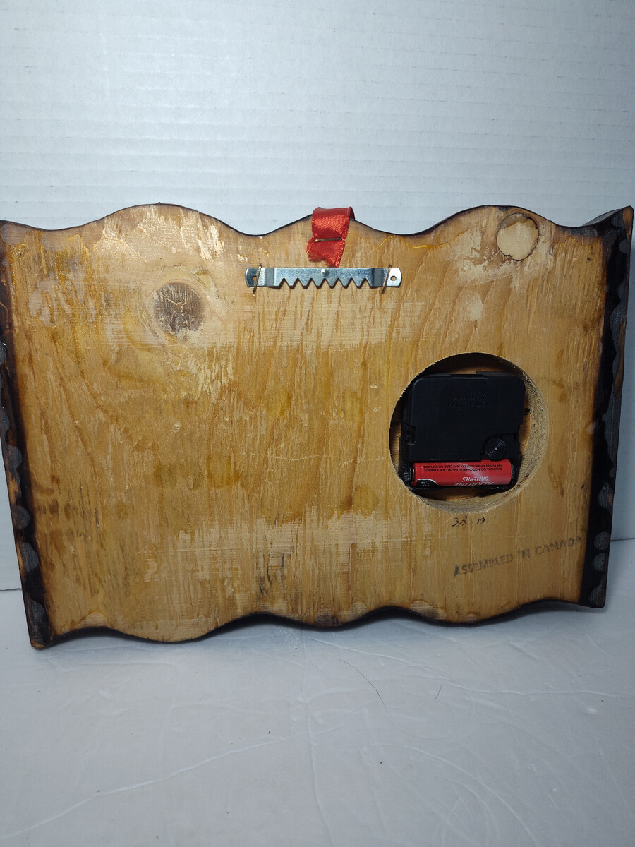 The clock has been fully tested and is in working condition. A video is included to demonstrate functionality. The wood frame and printed design are in nice shape overall, with only minor signs of wear from age.