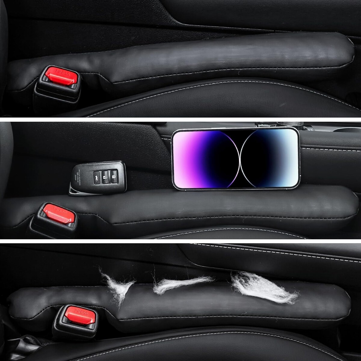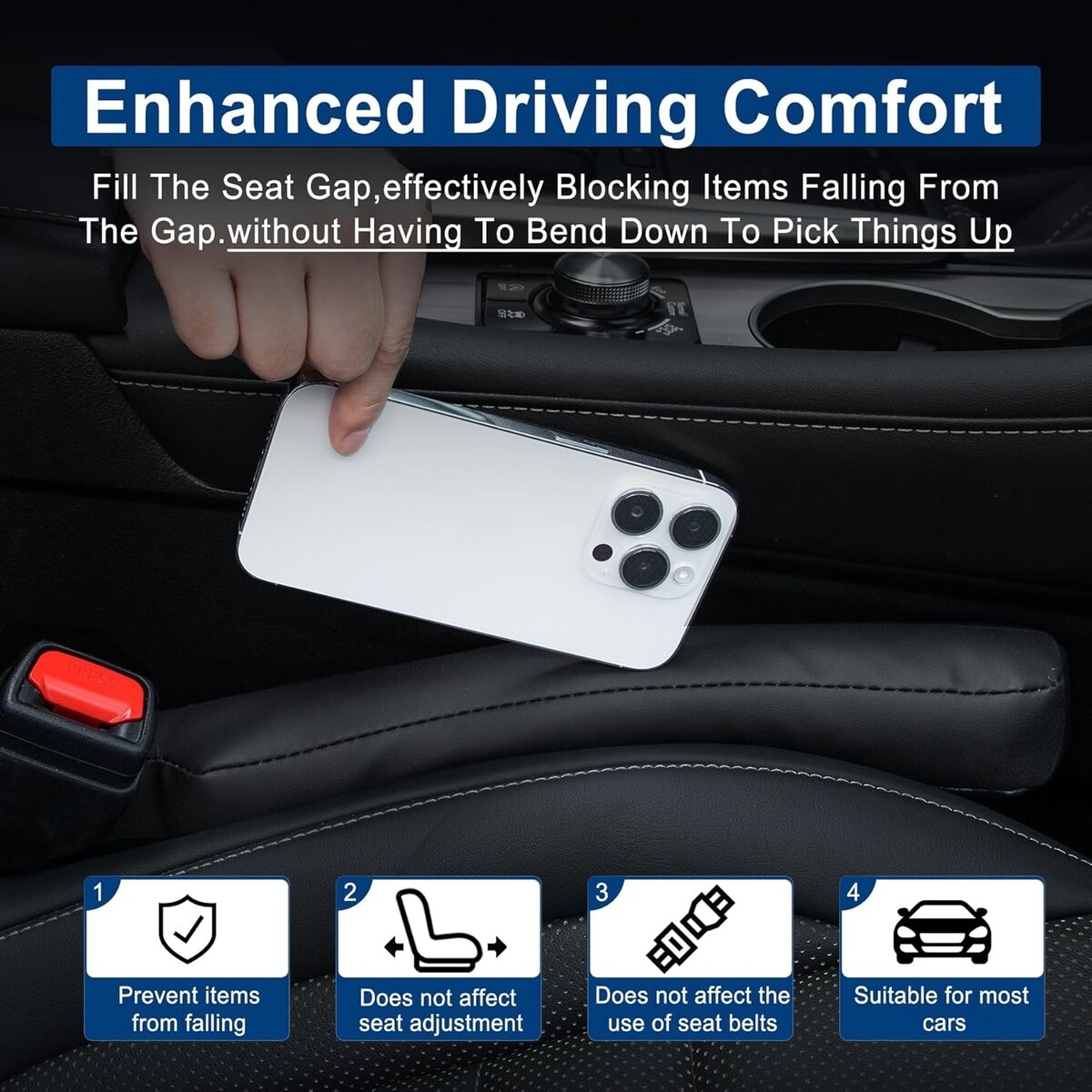 Universal Fit: Tailored for most cars, trucks, and SUVs with a seat gap of less than 2.23 inches, these seat gap fillers seamlessly adjust as your seat moves backward or forward.