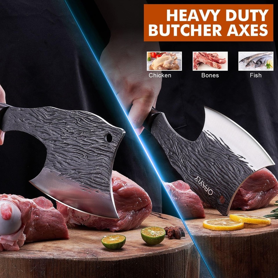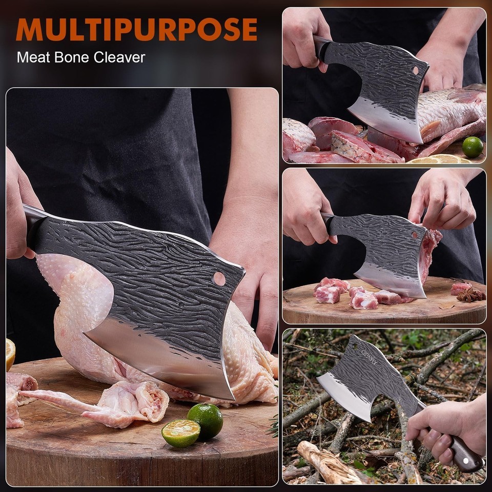 OPAYLY Heavy-Duty Bone Chopper Knife Hand Forged Meat Cutting with Cover Meat Bo