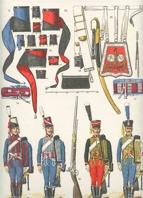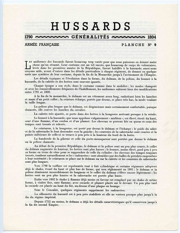 This great 4 page folder with a 2 page color illustration of the uniforms and decorations of theHussards Generalites 1790 - 1804. Printed on heavy stock, it opens to about 19" x 12 1/2". Included is a separate 4 page explanation of the Unit and of the uniforms shown. All in French and in very fine condition. This is Planche No. 9 by L Rousselot from 1965, Ses Uniformes, Son Armement and Son Equipement.