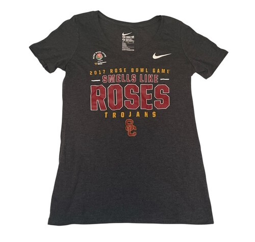 fficial Nike USC Trojans 2017 Rose Bowl Game T-shirt featuring the ?Smells Like Roses? graphic with the Rose Bowl logo and USC Trojans emblem on the front. A great collectible shirt celebrating USC?s memorable 2017 Rose Bowl appearance.