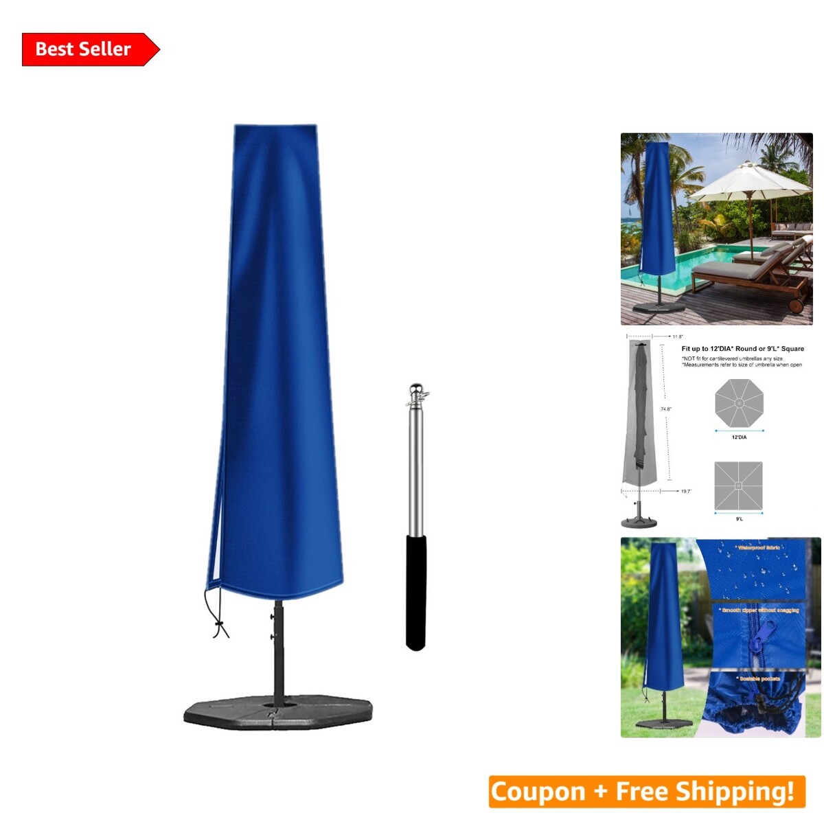 Size Compatibility: Fits large market umbrellas up to 12 ft in diameter (Round) or 9 ft in length (Square). Not suitable for cantilevered umbrellas.