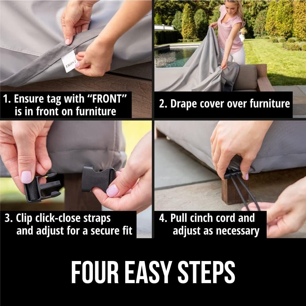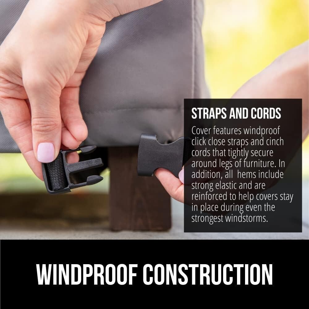 Windproof Straps: Features click-close straps to securely fasten around furniture legs, with adjustable cinch cords for a snug fit in any weather.