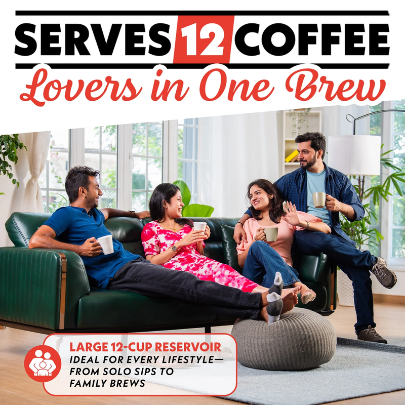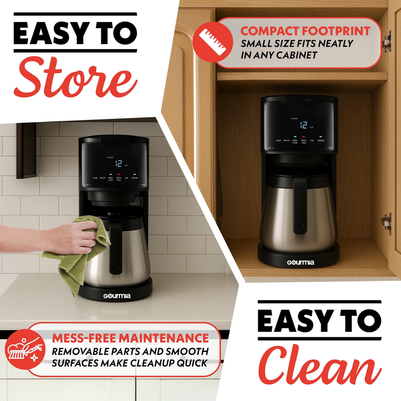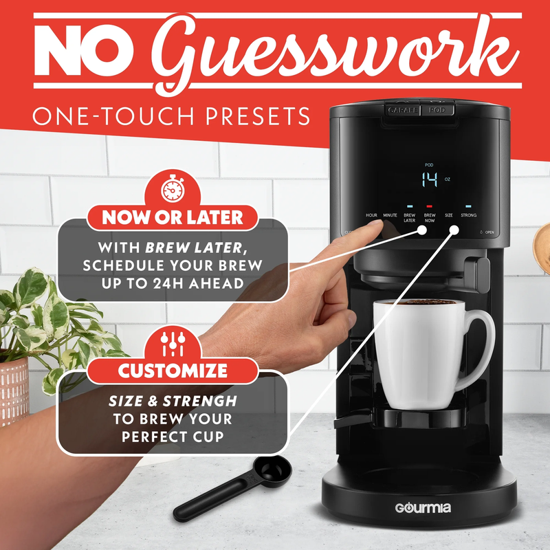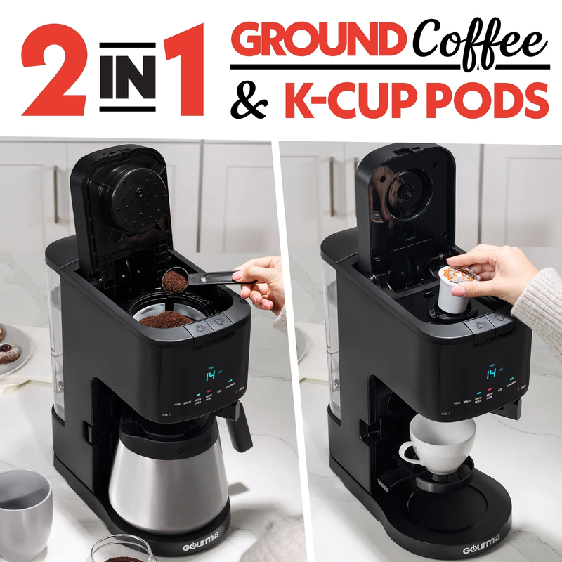 Brew just the right amount of coffee every time with the Gourmia GCM2218 2-in-1 Single Serve 12-Cup Coffee Maker. This versatile machine is designed for both pods and ground coffee?no adapters, no hassle. Choose between brewing a single cup directly into your favorite mug or travel tumbler, or up to 12 cups in the included double-walled thermal carafe that keeps coffee hot and flavorful for longer. The large, easy-to-use display automatically adjusts to show available brew sizes depending on your selection, making it simple to get the perfect amount. Use the convenient Brew Later feature to schedule coffee in advance, or take advantage of Pause Serve to pour a cup before the brewing cycle is finished.