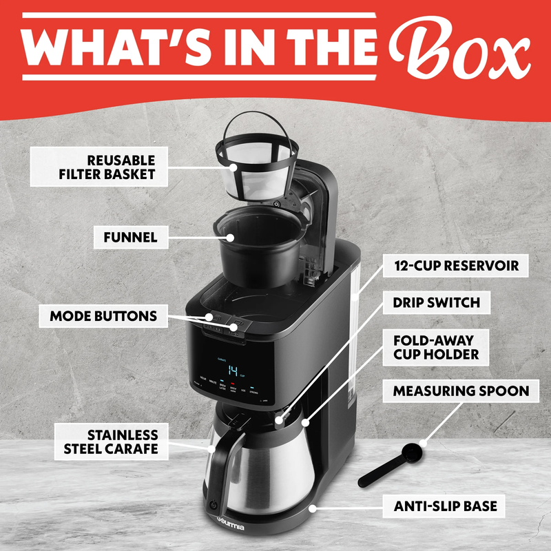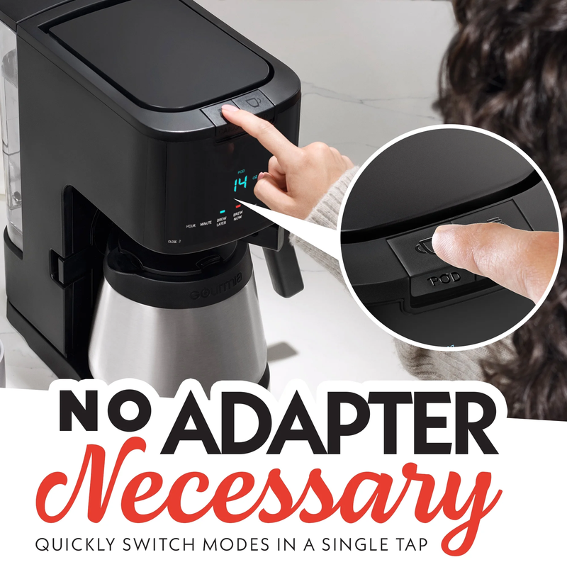 Brew single cups with pods or a full 12 cups with ground coffee ? no adapter needed Double-walled stainless steel Thermal carafe keeps coffee hot while preserving fresh flavor, without the need for a warming plate Brew Later function lets you set coffee to brew in advance so it?s ready when you are Clear lcd display showing time, carafe/pod mode, brew size, and brew later Compact countertop design