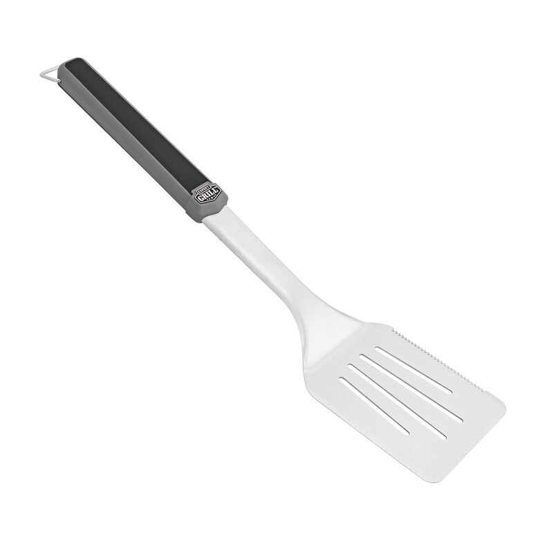 This 4 piece BBQ tool set includes 1 grilling tong, 1 large spatula, 1 grilling fork, and 1 basting brush Crafted from rust resistant stainless steel Heavy duty design for durability and long-lasting use Convenient long reach plastic handle with ergonomic grip Built-in hooks for easy storage and hanging Spatula features serrated edge for cutting Tongs include teeth edge for improved grip when picking up or flipping food Each tool is 19.09 inches in length Dishwasher safe for easy cleanup Made from 20% post consumer recycled materials