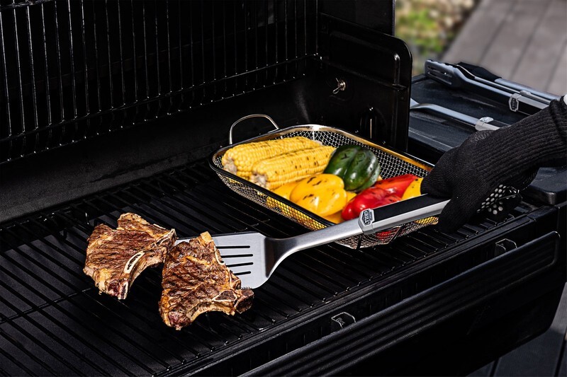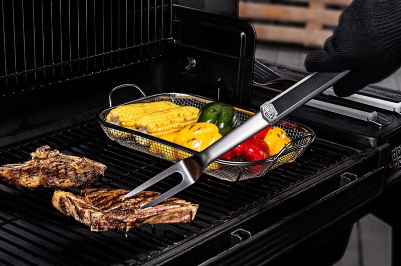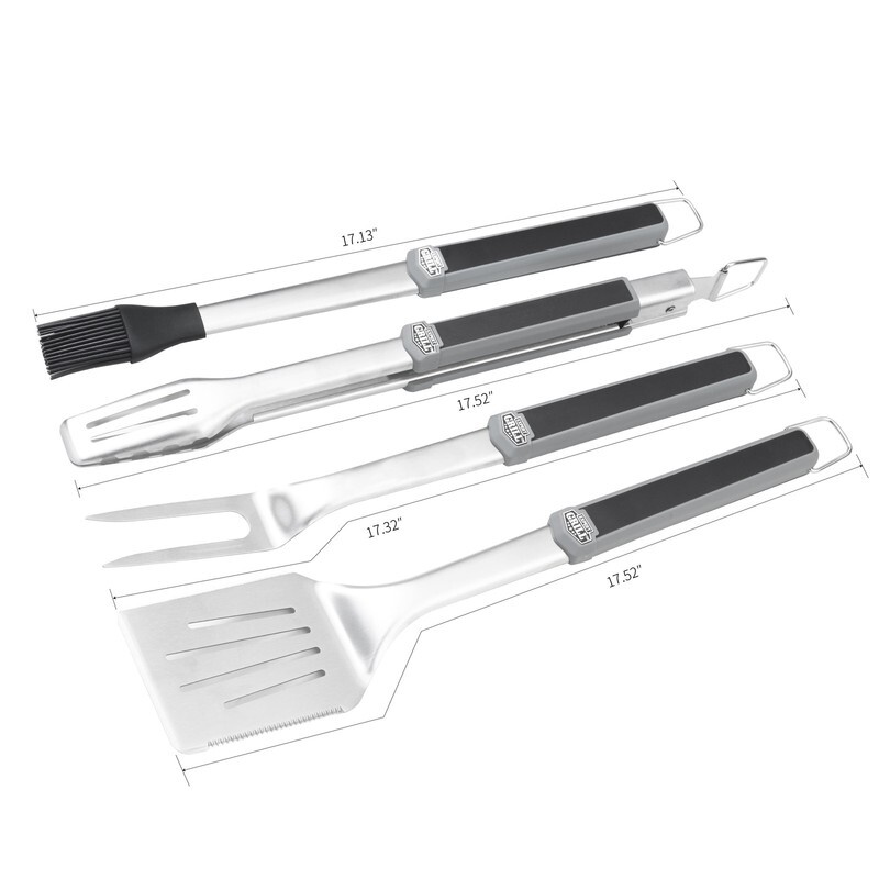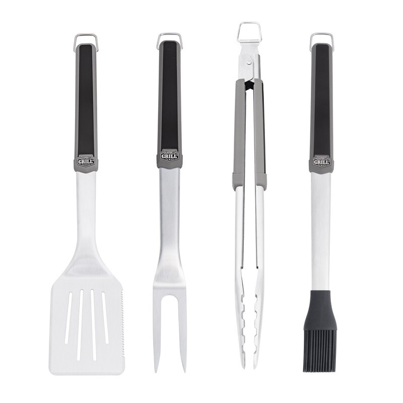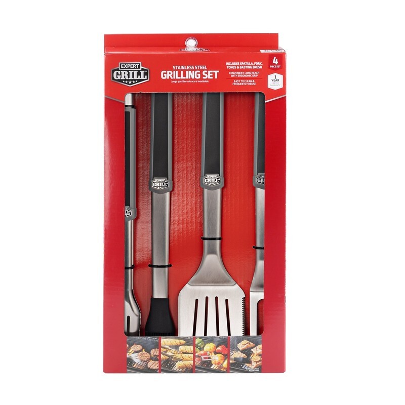 Expert Grill professional 4-piece BBQ tool set is a grill master?s dream. Set includes a barbecue spatula, meat fork, tongs, and basting brush. This BBQ tool set is constructed of solid food-grade stainless steel. Designed to resist rust and warping, these grilling tools are built to last. Expert craftsmanship and the highest quality materials were used to create this top-of-the-line BBQ tool utensil set. Each handle of this heavy-duty grilling set has been upgraded with non-slip, rubberized coating for superior comfort while flipping, skewering, rotating, and basting your grilled masterpieces.