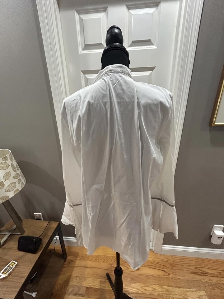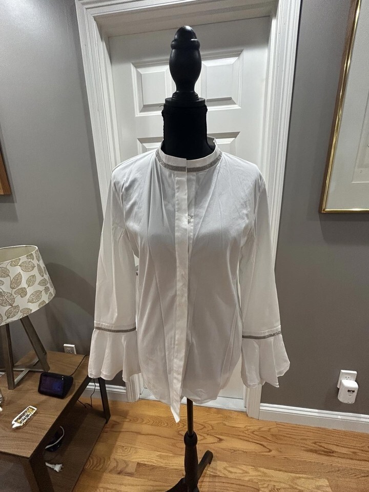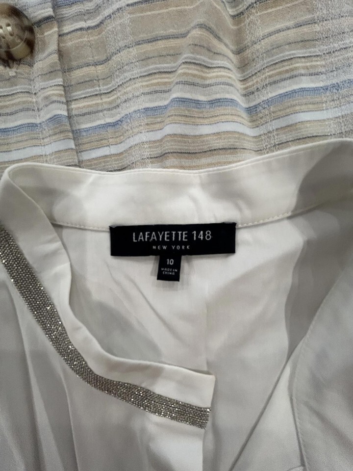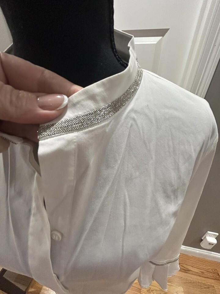 Lafayette 148 White Long Sleeve Blouse with Silver Rhinestone Trim Sz 10
