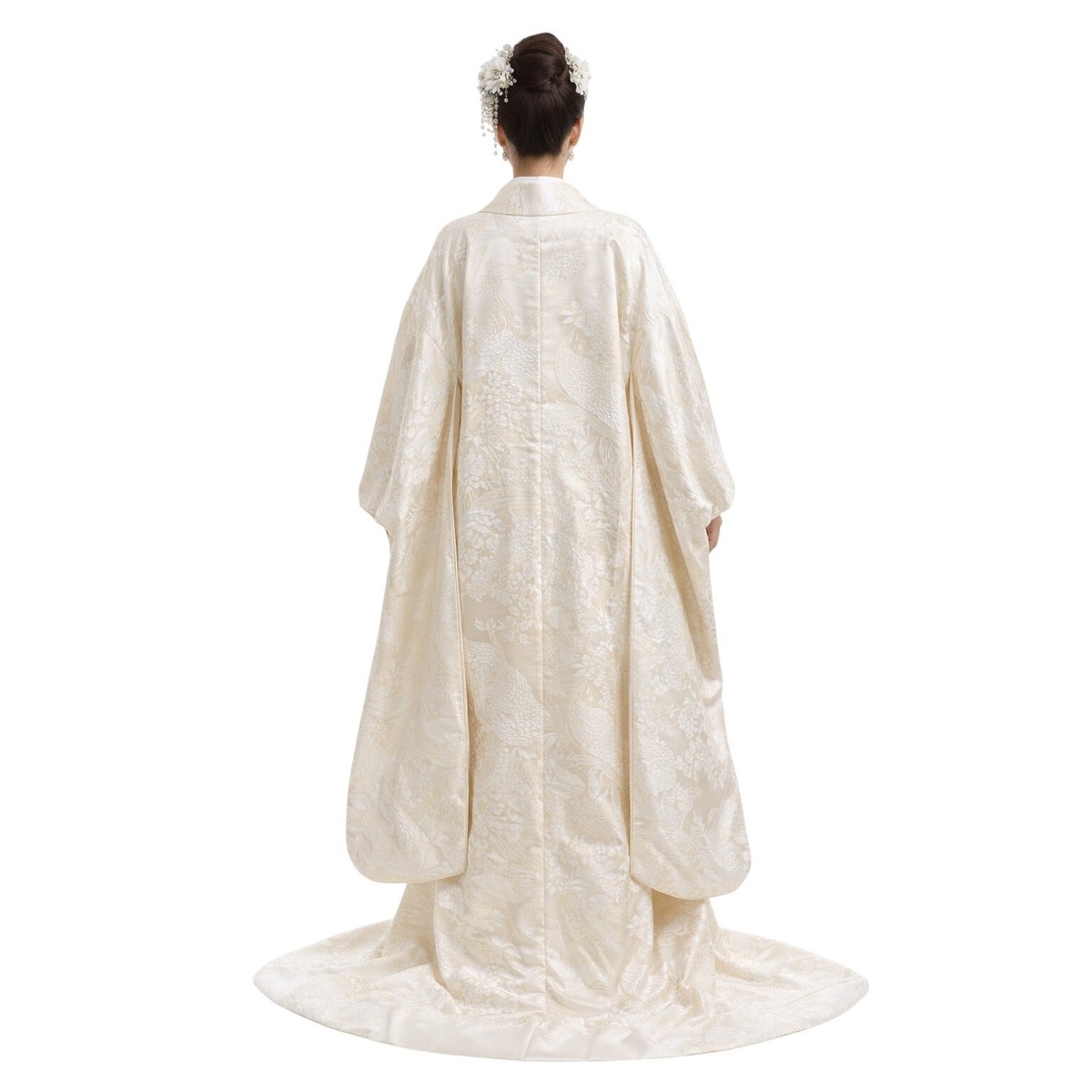 What you?ll love about this vintage Japanese uchikake wedding kimono is the extraordinary quiet luxury ? luminous ivory silk damask woven with peacocks and florals that reveal an iridescent, oil-slick sheen as the light shifts. It is elegant rather than flashy, relying on texture, symbolism, and craftsmanship for impact.