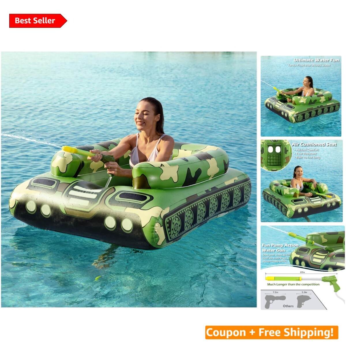 This Inflatable Tank Float is your ticket to a summer of laughter and excitement. With its durable, high-quality construction and features tailored for maximum fun, you?ll be diving into endless aquatic adventures and thrilling water fights. Whether it?s a pool party or a sun-soaked beach day, this float guarantees everyone will have a splashing good time!