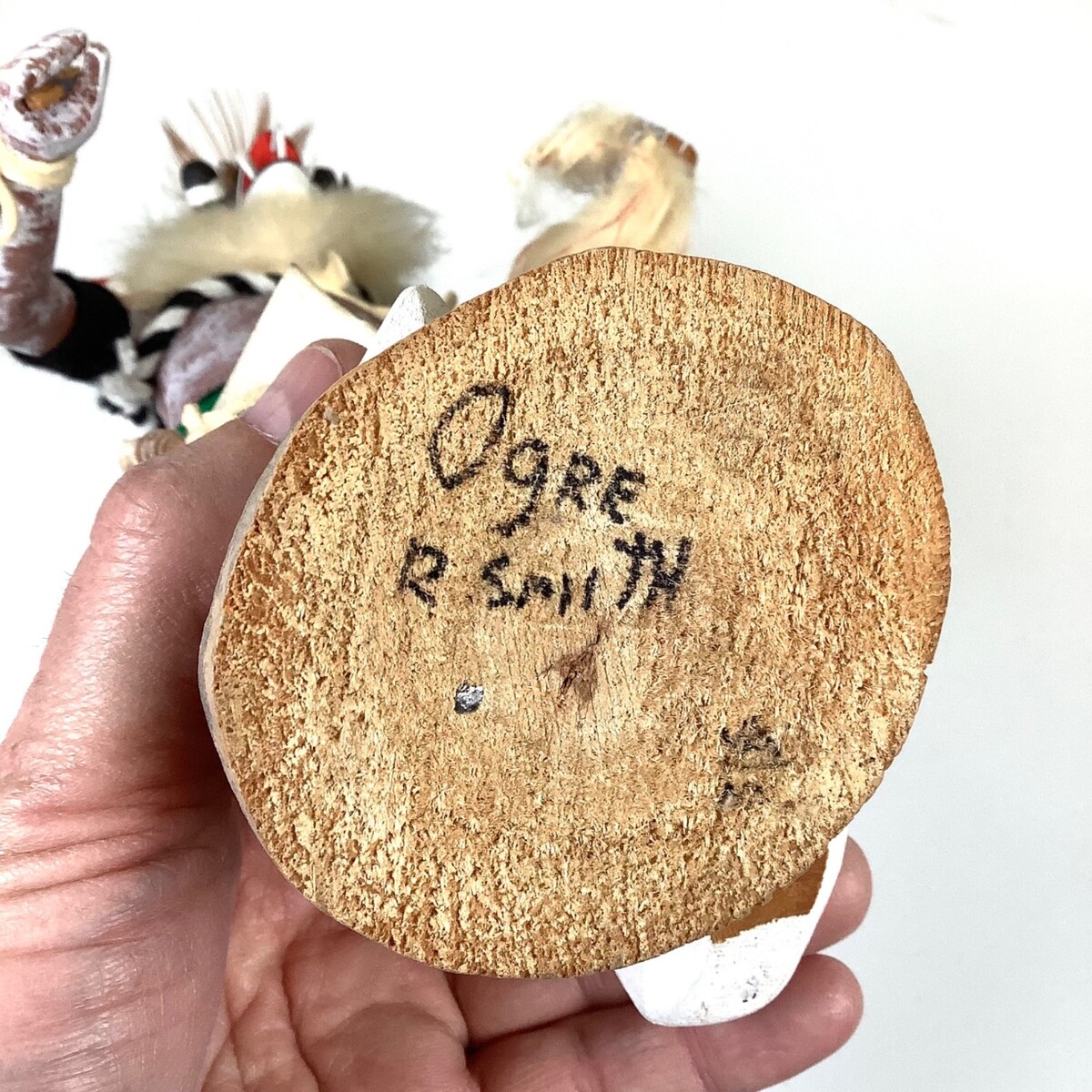 Ogre R Smith on base (unverified artist). Incredibly detailed Kachina that includes shells, hide and feathers, and some pretty gnarly teeth! Measures approximately 10.25 inches high. Please see all photos.
