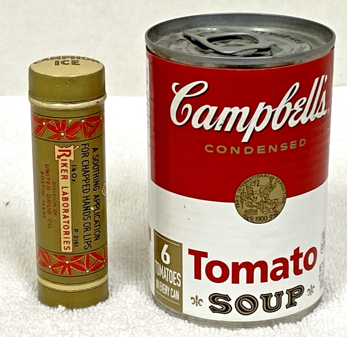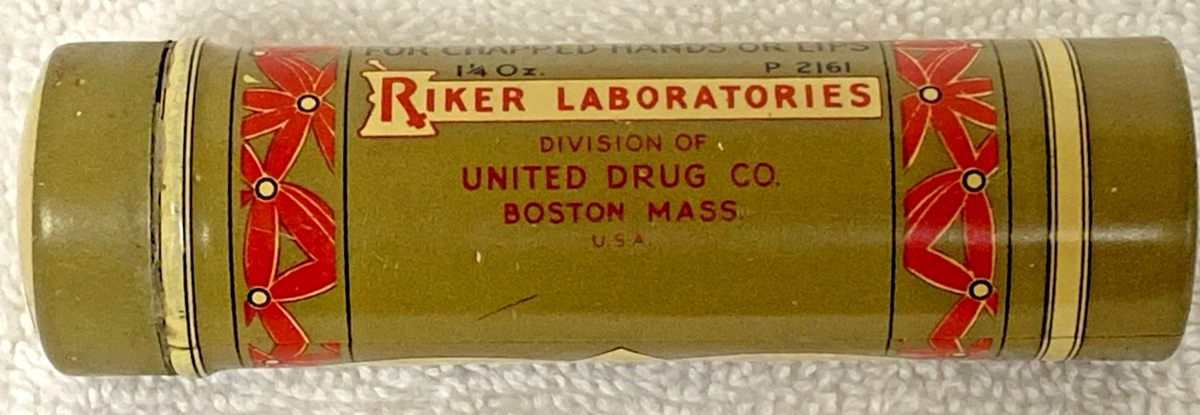 Vintage 1930s United Drug Camphor Ice Lithographed Advertising Tube Tin. Very good condition olive green orange lithographed advertising tube shaped tin for Riker Laboratories Camphor Ice chapped hands lips, United Drug Boston, Mass tin measures approx. 3 5/8" long and 1" wide, round tube tin in very good condition, lettering and color really nice shape. See pictures.