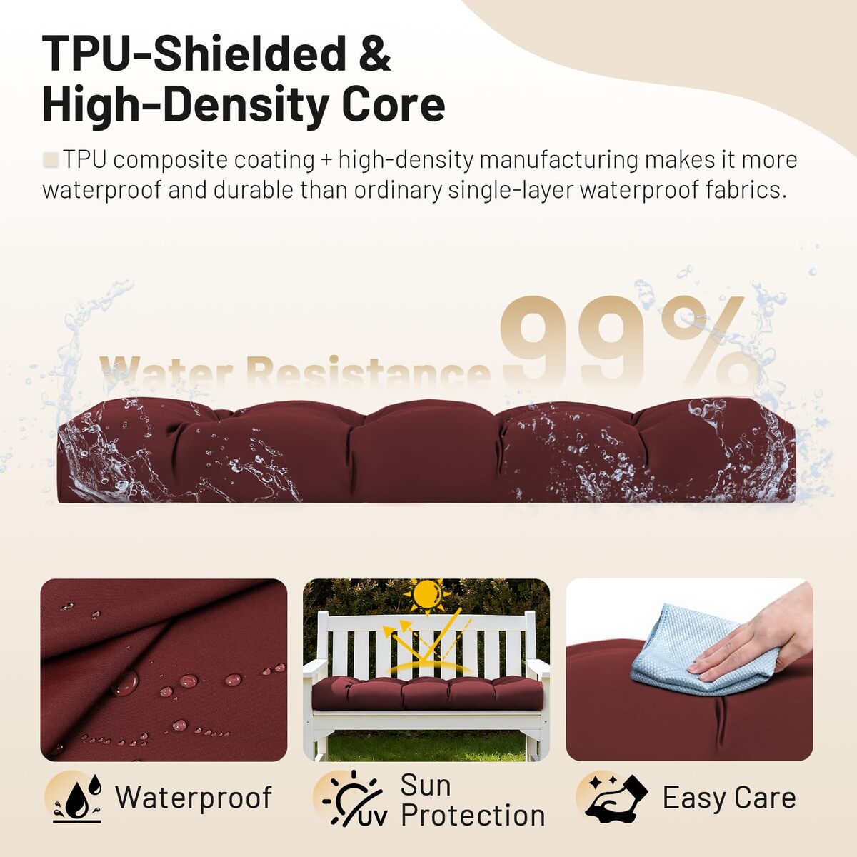 [WATERPROOF FABRIC]:The cushion fabric has been treated with a special compound and covered with a TPU coating that stops rainwater from seeping in, which possesses waterproofing and improves the durability of these outdoor cushions, making them more suitable for daily outdoor use than other ordinary cushions