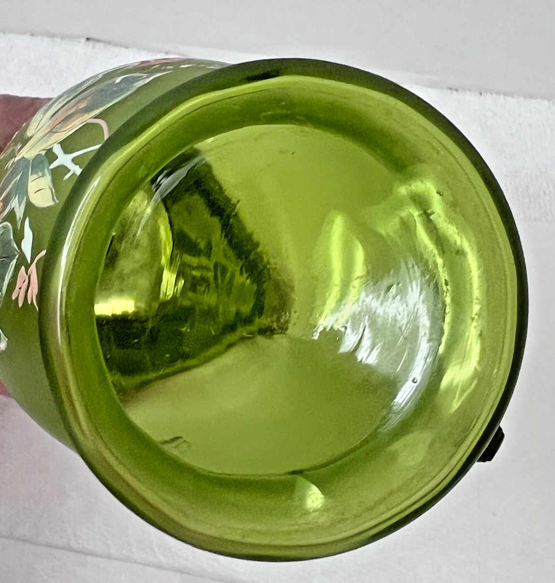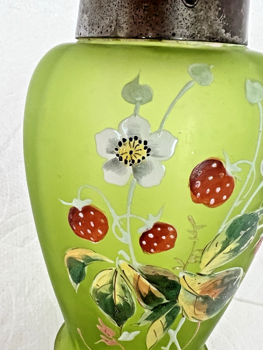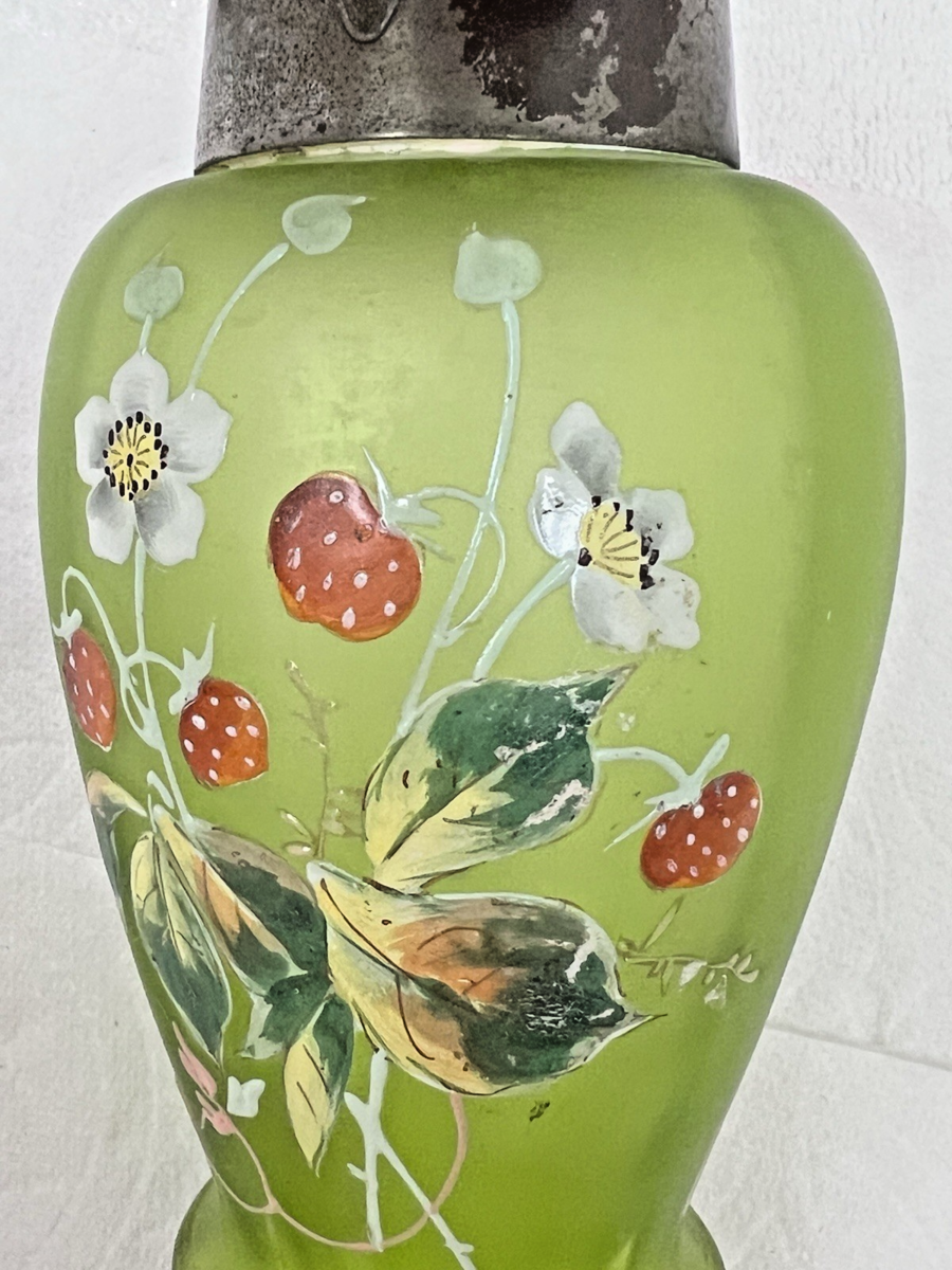 Antique Enameled Strawberry Floral Pitcher w Metal Lid Handle 6 inch The green is a satin Alvacado green but not the 1970's shade it's a lovely brighter cleaner shade. Condition the glass has 2 small dark marks see photos. The enamel is excellent no chipping now the metal we have not tried to polish it, and it has discolored spots we are sell it as is due to these spots. It is a beautiful shape and style