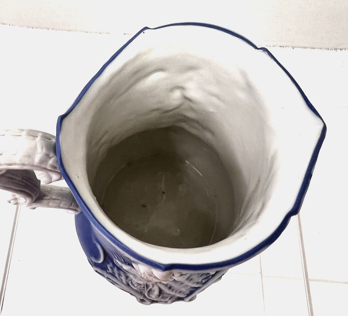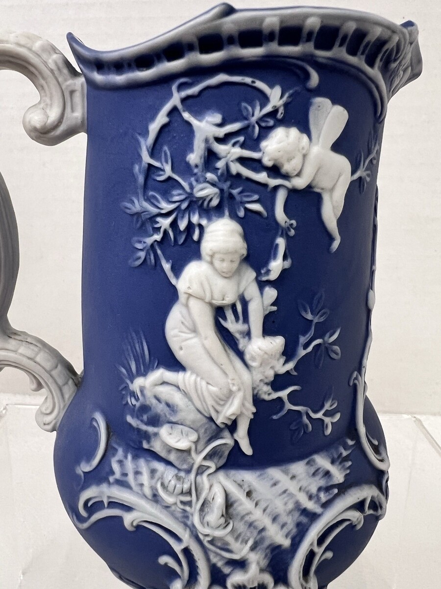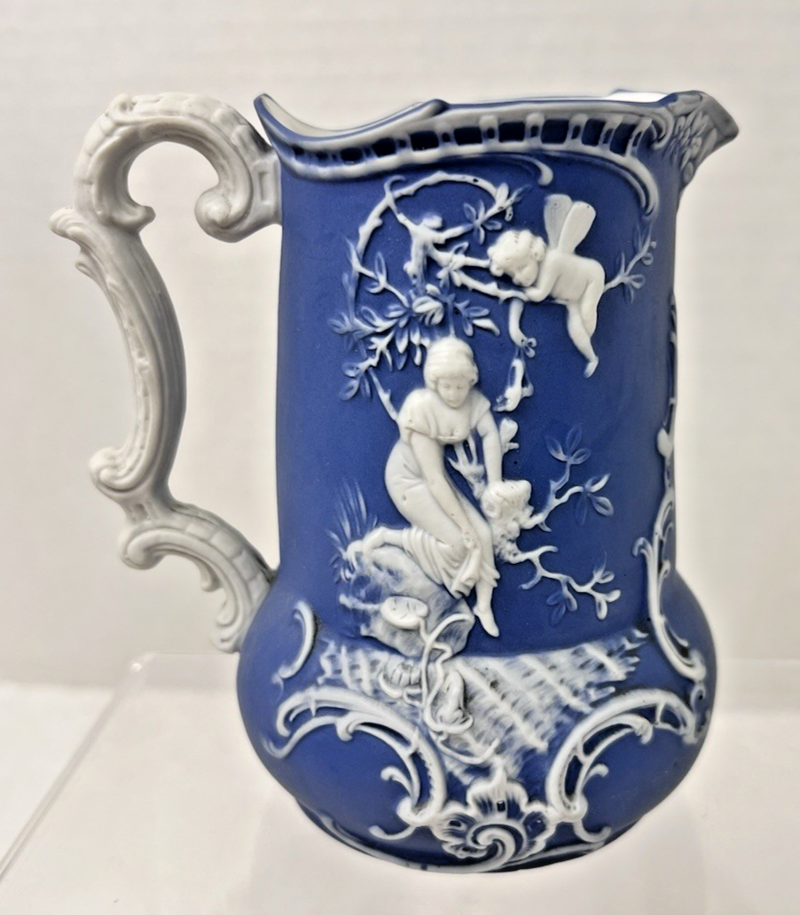 Antique Schafer and Vater Blue White Jasperware Winged Cherub Design Pitcher 5" In great shape the color is brighter in the photos than in person ...we used a flash No chips cracks breaks the design is lovely