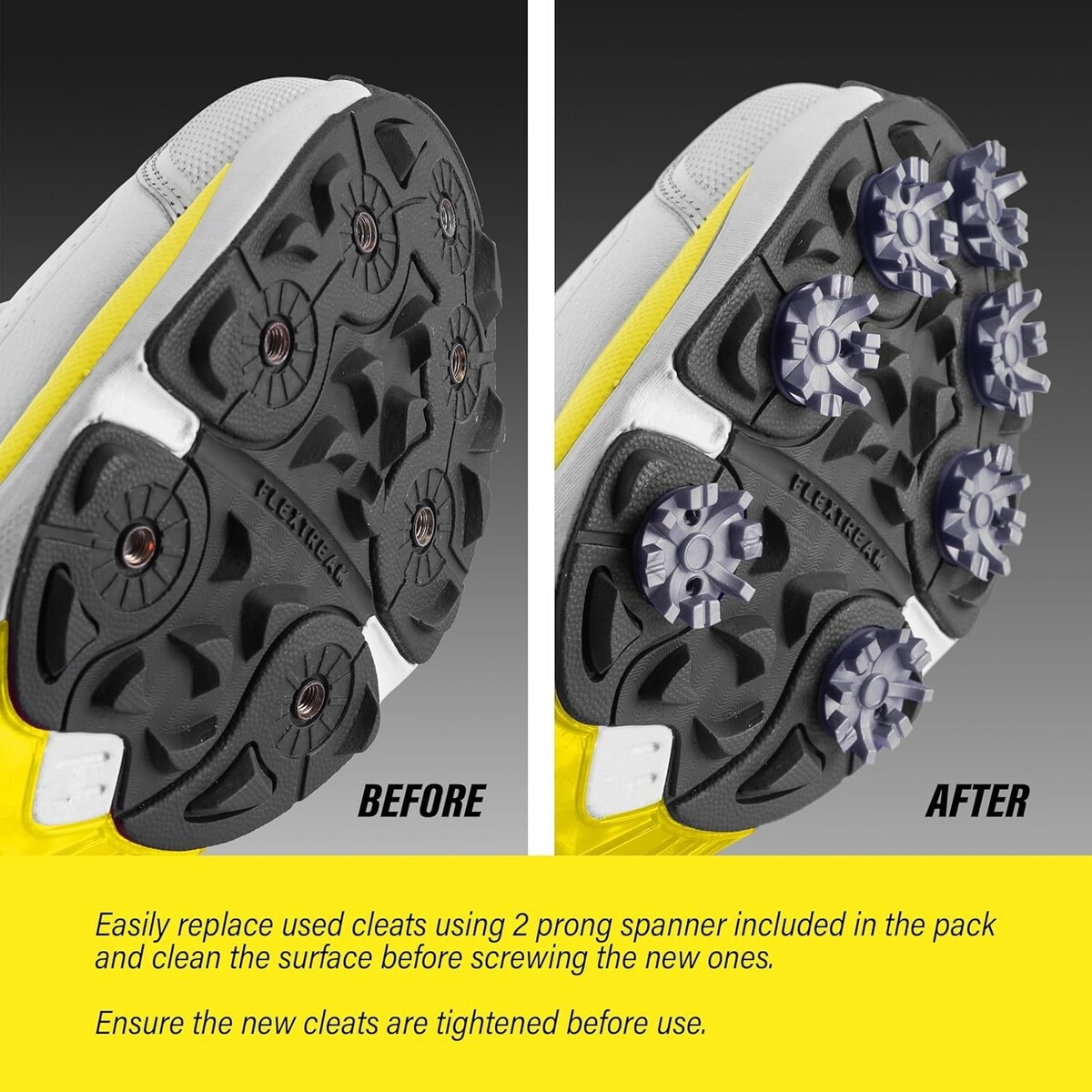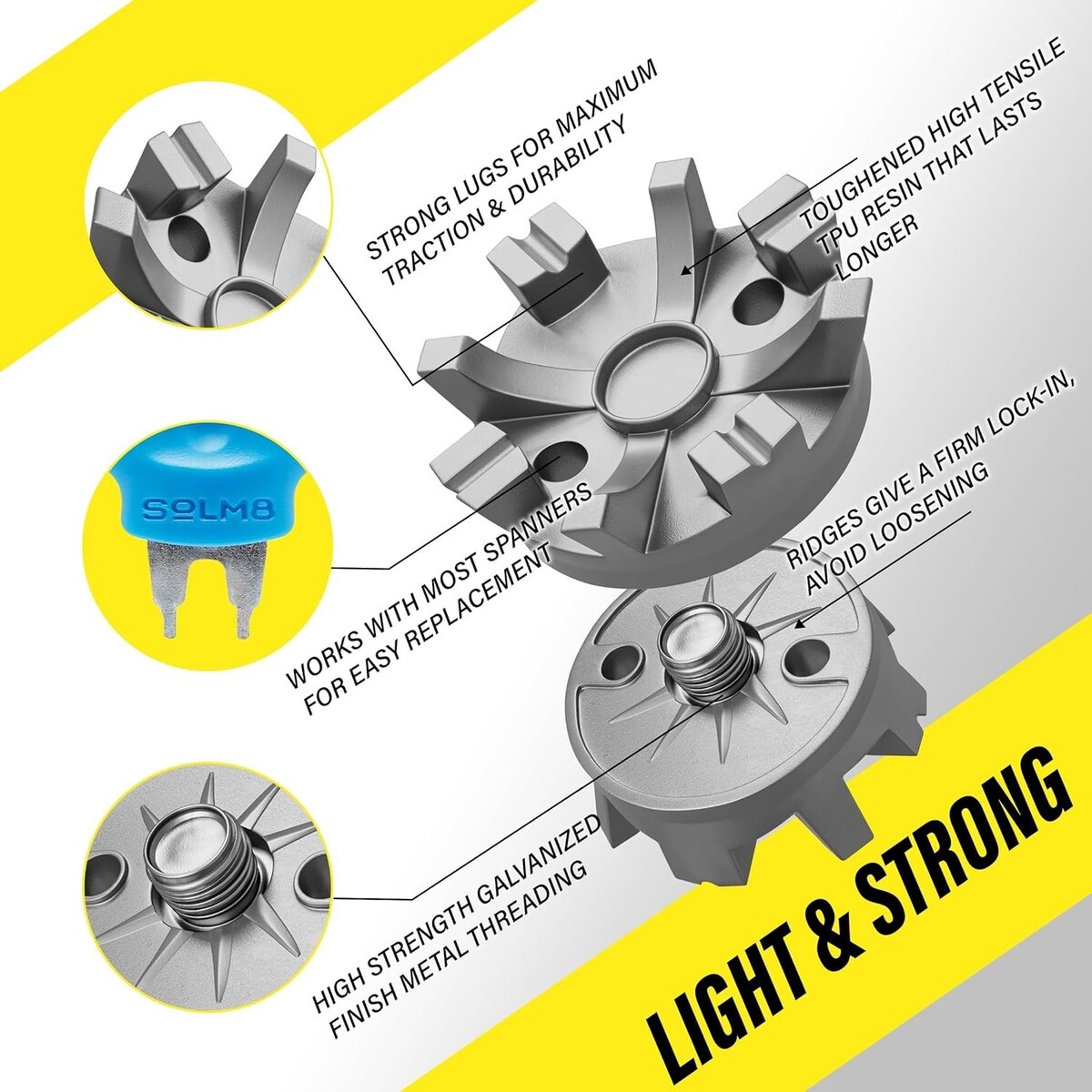 PACKAGE INCLUDE: 24 Pcs TPU golf cleat set and a Solm8 Spanner for easy installation and replacement of used spikes with metal threading golf shoes.