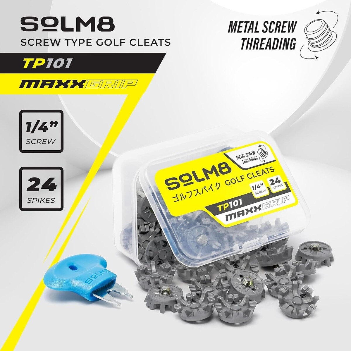EASY TO REPLACE: Solm8 Maxx Grip Golf Cleats come in a handy storage box for unused spikes. Includes a universal-fit blue spanner for quick, effortless spike replacement.