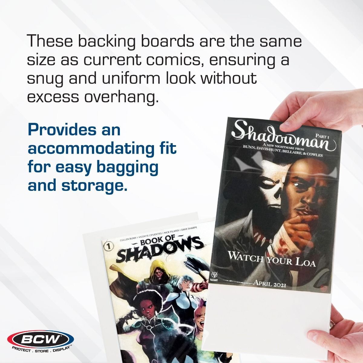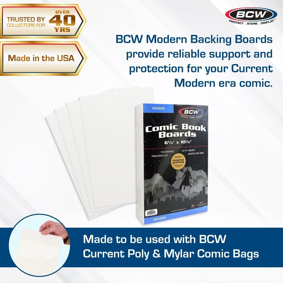 Preserve the condition and value of your modern comic book collection with BCW Modern Comic Backing Boards. These backing boards are certified acid-free through independent laboratory testing, guaranteeing that your comics are shielded from the harmful effects of acidity over time. Crafted from high-quality 24 point solid bleached sulfate, these boards are coated and buffered on one side with 3% calcium carbonate for added strength and protection. Invest in the longevity of your collectibles with BCW Modern Backing Boards, the trusted choice for comic book enthusiasts and collectors alike. Use these along with Modern/Current Comic Bags to protect and store your Modern Age comics.