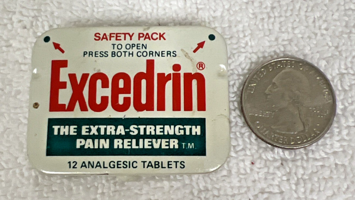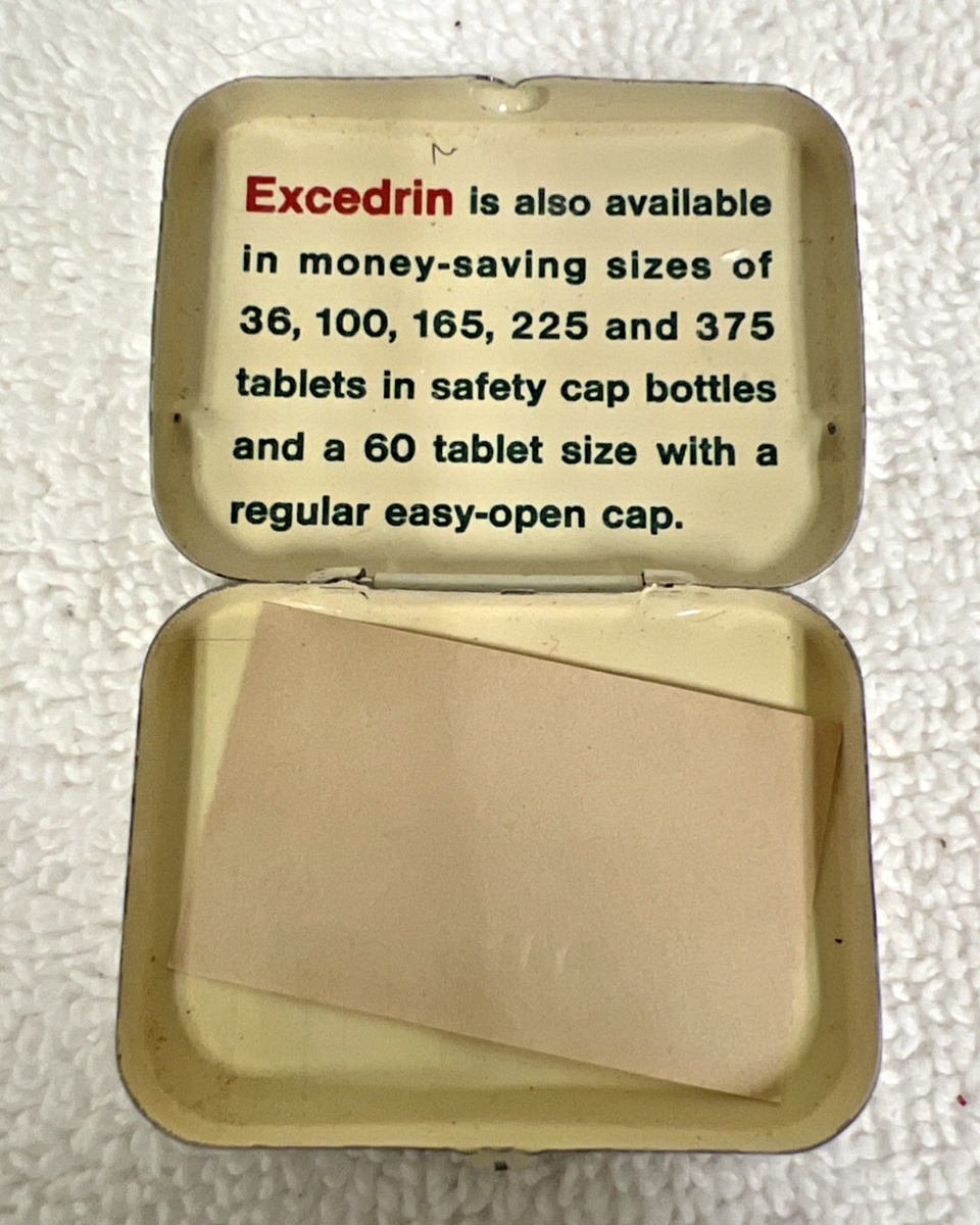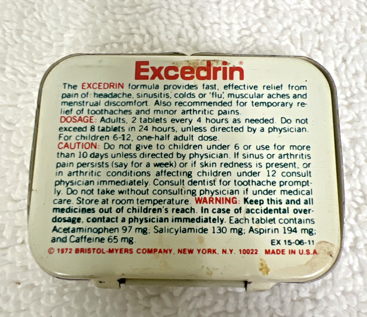 Vintage Medicine Drugstore Advertising Excedrin Aspirin Analgesic Tablets Tin. Vintage safety pack Excedrin pain reliever medicine tin, measures approx. 1 7/8" x 1 1/2", clean inside, overall nice condition. See pictures.