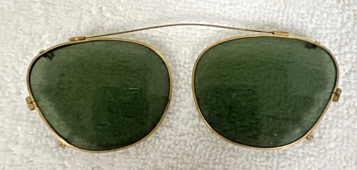Vintage Willson Gold Rim Filt-Ray Over Specs Clip On Sunglass Leather Case. Nice condition Filt-Ray over specs clip on sunglasses, marked Willson Made in USA, measure approx. 4 1/4" long, no damage or scratching to lenses, gold rim in good condition unmarked as to gold or gold filled, case is in good condition, gold gilt lettering intact. See pictures.