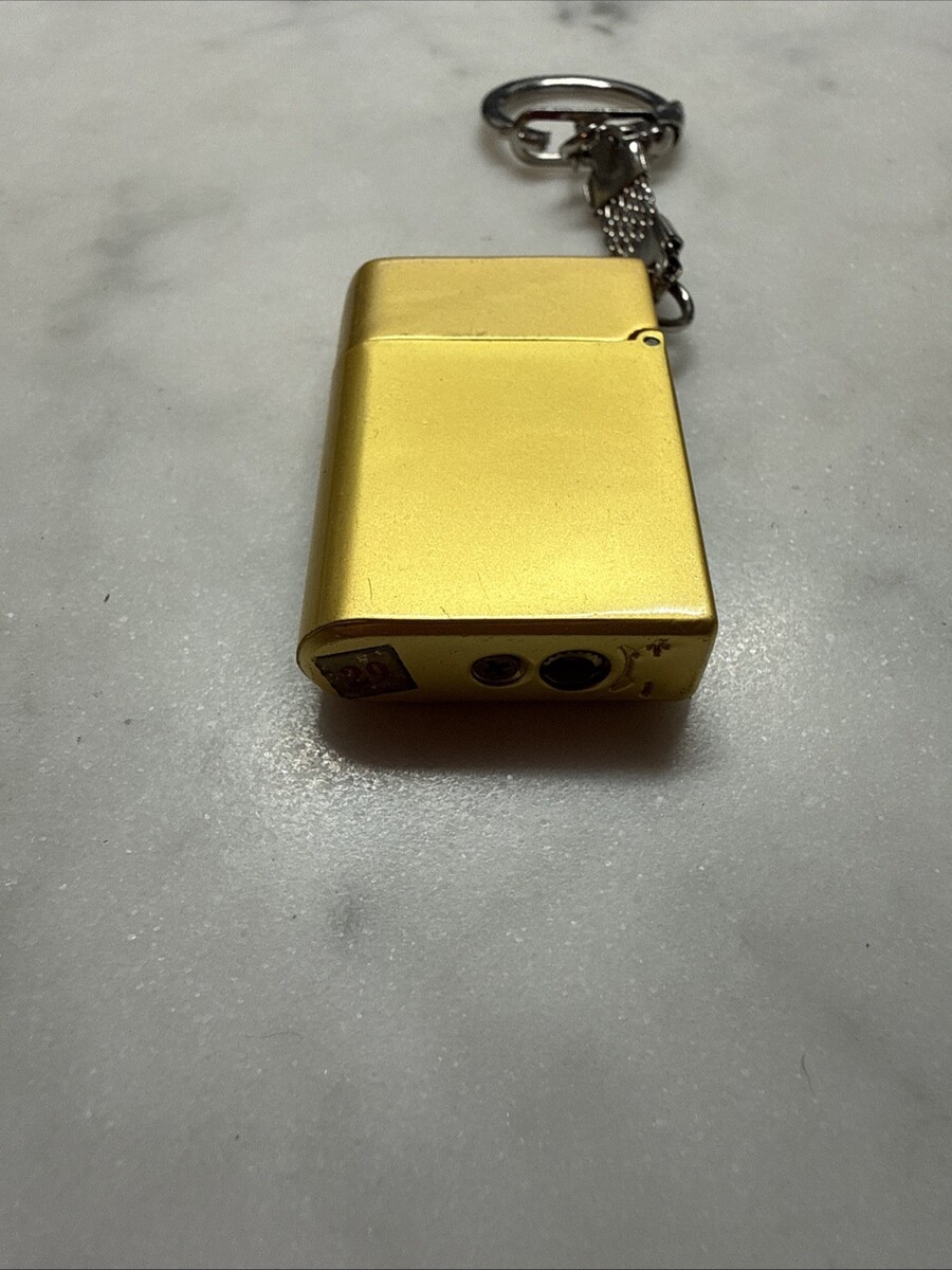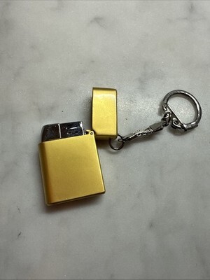 This vintage keyring key chain is a miniature gold metal cigarette/cigar lighter. It is a unique and collectible item that features a functional lighter design in a classic gold color. The keychain allows for easy transportation and storage while adding a touch of vintage charm to any collection of lighters or keychains.