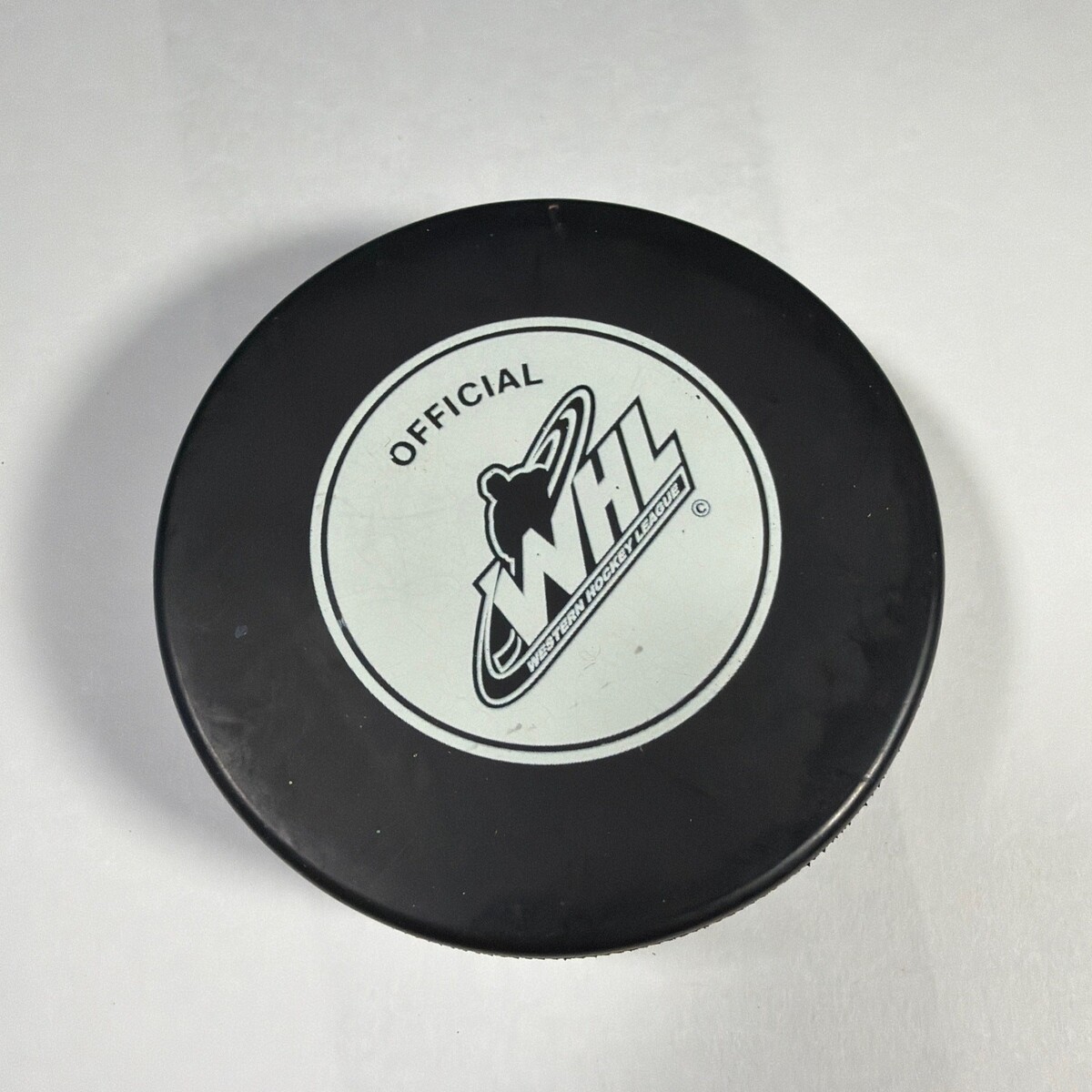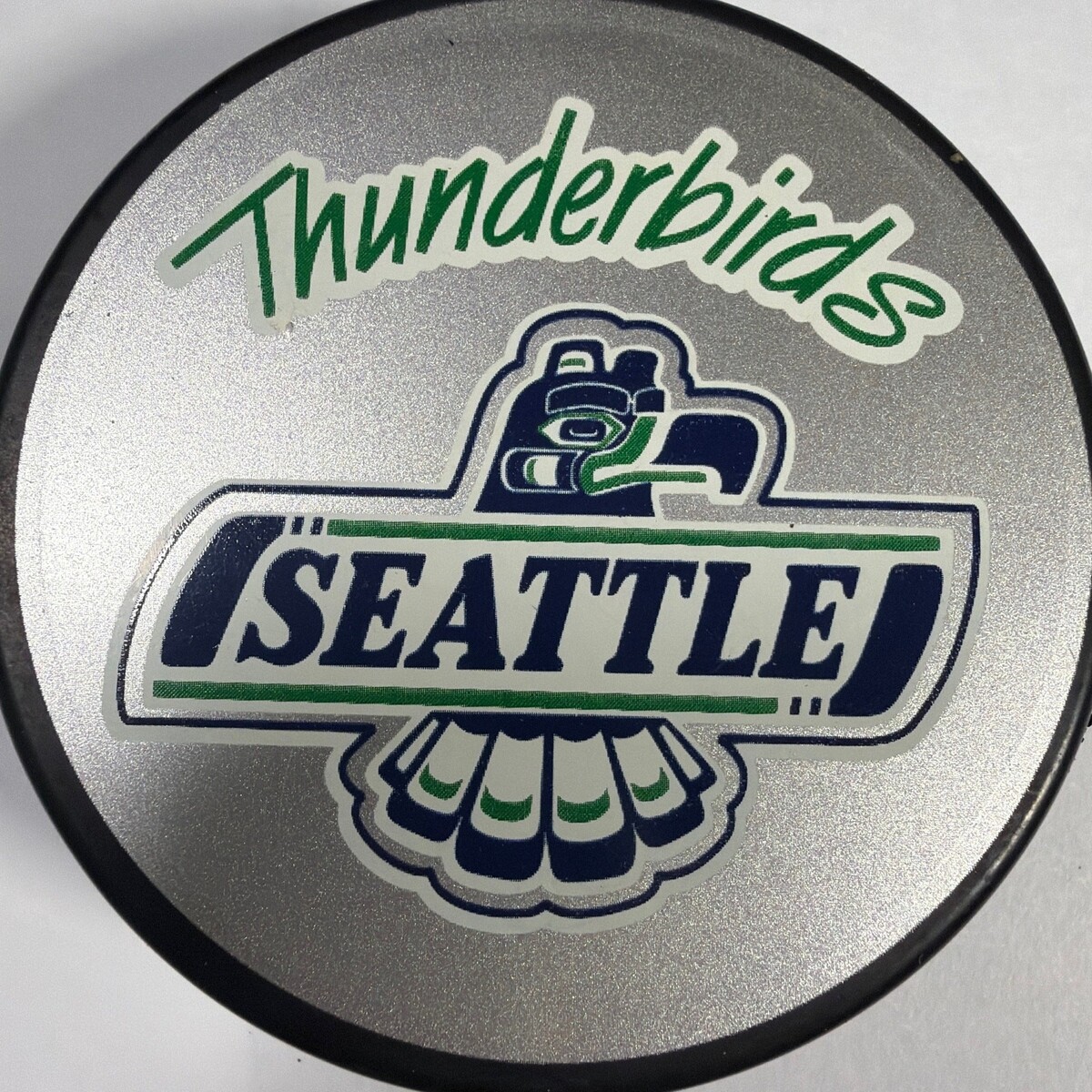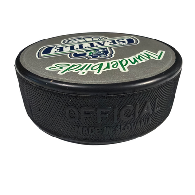 Official Western Hockey League (WHL) Seattle Thunderbirds logo hockey puck by InGlasCo. Black puck with a silver Thunderbirds graphic on one side and the WHL mark on the other. Appears pre-owned with light scuffs/marks from handling and storage. Includes 1 puck only.