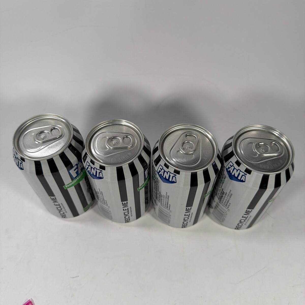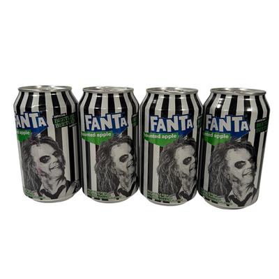 Sealed lot of four limited-edition Fanta Haunted Apple 12 fl oz cans with Beetlejuice-themed artwork. Cans appear unopened and intact, but may have minor shelf wear or small dings from storage/handling.