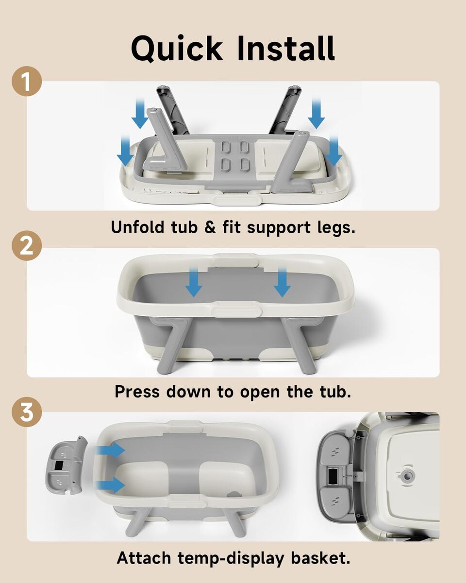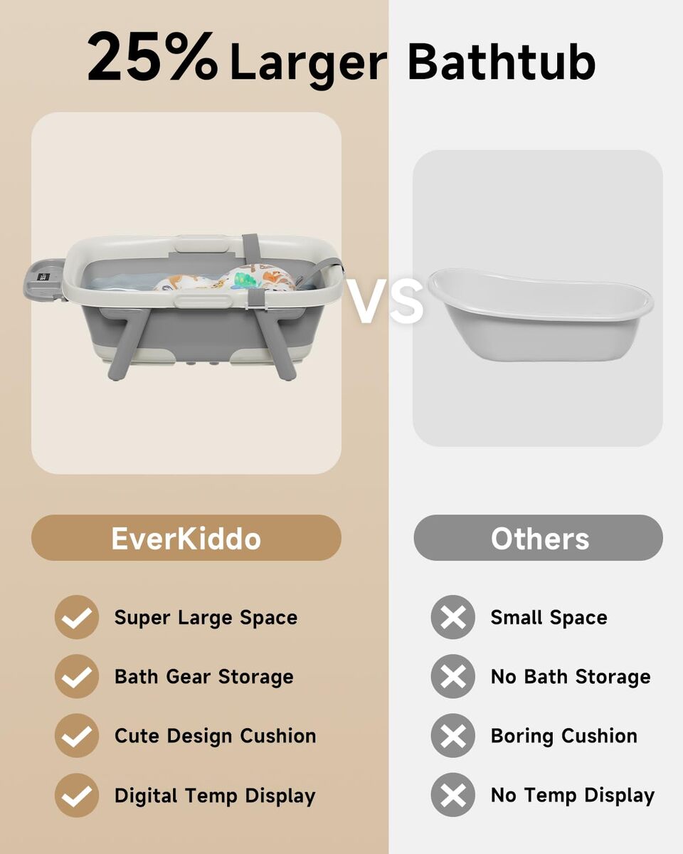 Real-Time Digital Temperature Monitor for Safe Bathing: Never guess the water temperature again with the EverKiddo baby bathtub. This advanced digital thermometer baby bath features a high-precision, integrated real-time temperature sensor that displays accurate readings on a clear LCD screen. Designed to protect the sensitive skin of newborns and infants, this thermometer bathtub ensures the bath water is always monitored, helping new parents prevent accidental burns or discomfort. This safety-first baby tub provides parents with total peace of mind during every single infant bathing session.,Space-Saving Collapsible Design for Travel and Small Homes: Our foldable baby bathtub is the ultimate solution for families seeking space-saving baby gear. This portable baby bathtub features a heavy-duty collapsible design that shrinks down to a slim, 3.5-inch profile in seconds, making it easy to store in tight spaces, hang on a bathroom wall, or tuck under a sink. Whether you need a travel-friendly baby bath for vacations or a portable basin for a small apartment, this collapsible baby bath offers unparalleled convenience without sacrificing the size or depth your baby needs.,Ergonomic Growth from Newborn to Toddler (0-36 Months): Invest in a long-lasting baby bathtub that grows alongside your child. This versatile baby bath basin is expertly engineered to accommodate newborns, infants, and toddlers from 0 to 36 months old. The spacious interior provides ample room for your growing toddler to splash and play, while the ergonomic design offers the necessary support for a newborn baby?s first few months. It is an essential nursery staple and a top-rated baby shower gift for new parents who want a multi-stage baby bathtub.,Superior Non-Slip Stability and Premium BPA-Free Materials: Safety and quality are at the heart of the EverKiddo design. This non-slip baby bathtub is equipped with reinforced, anti-skid support legs that lock securely into place on any flat surface, providing a stable base that won't wobble or slide. Crafted from high-quality, BPA-free, and PP materials, this eco-friendly baby bathtub is gentle on infant skin and incredibly durable. The slip-resistant textured bottom ensures your little one stays safely in place, making it safer baby tub option on the market....