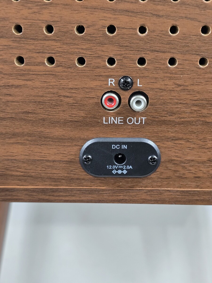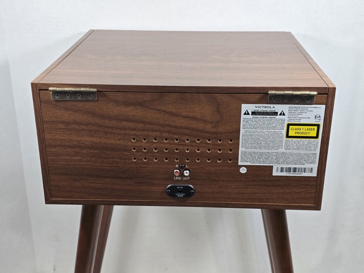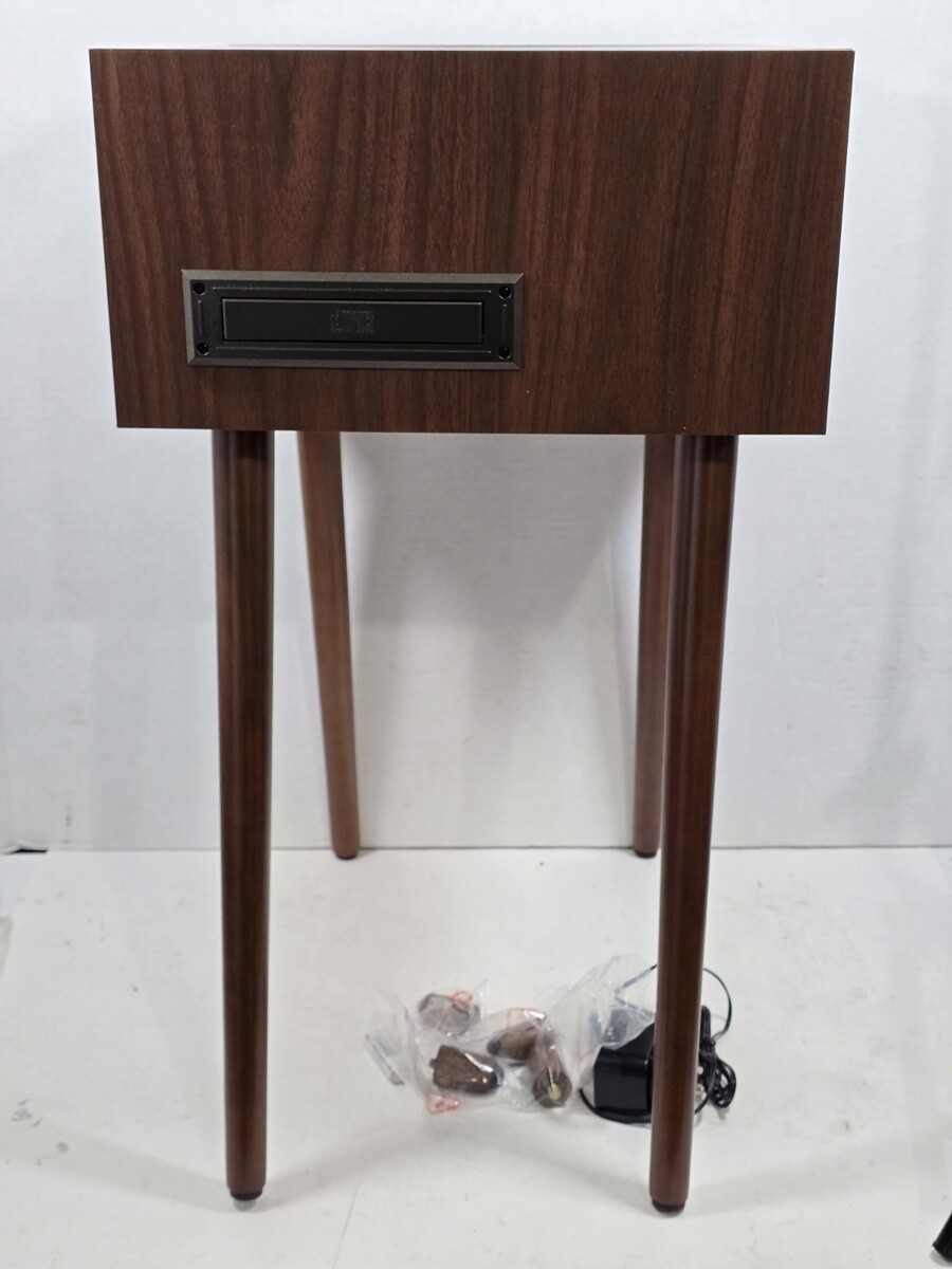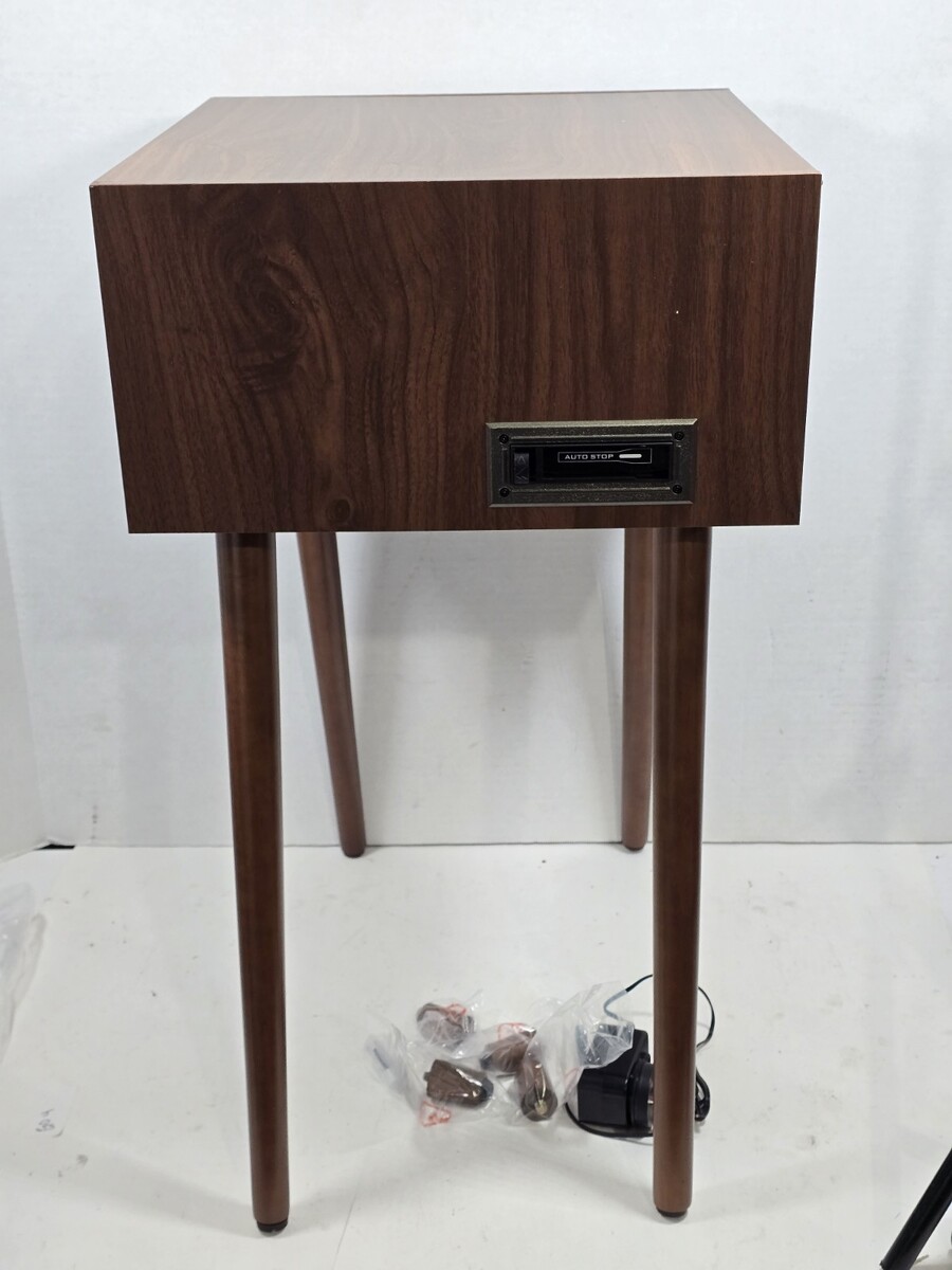 The record player is defective. It works but the sound is defective for some unknown reason ( its not the needle ). All other functions Bluetooth, Tape Player, CD Player and Auxiliary WORK and sound excellent. Comes with shorter legs, battery for clock and power adapter.