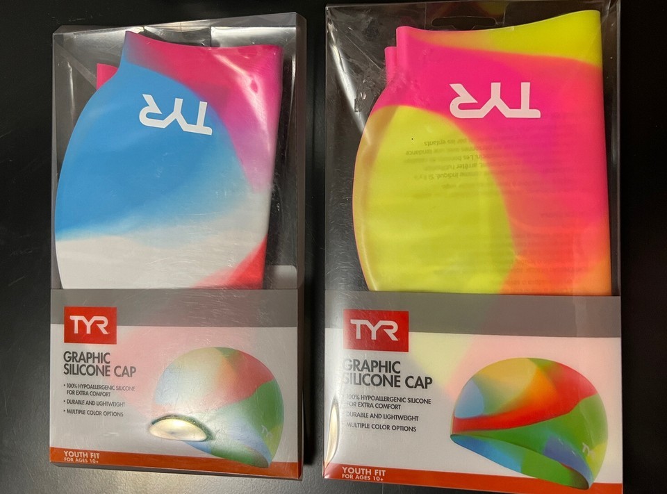 Lot of 2 TYR Silicone Youth Fit Swim Cap Colorful Blue Pink Tie Dye Graphic NIP