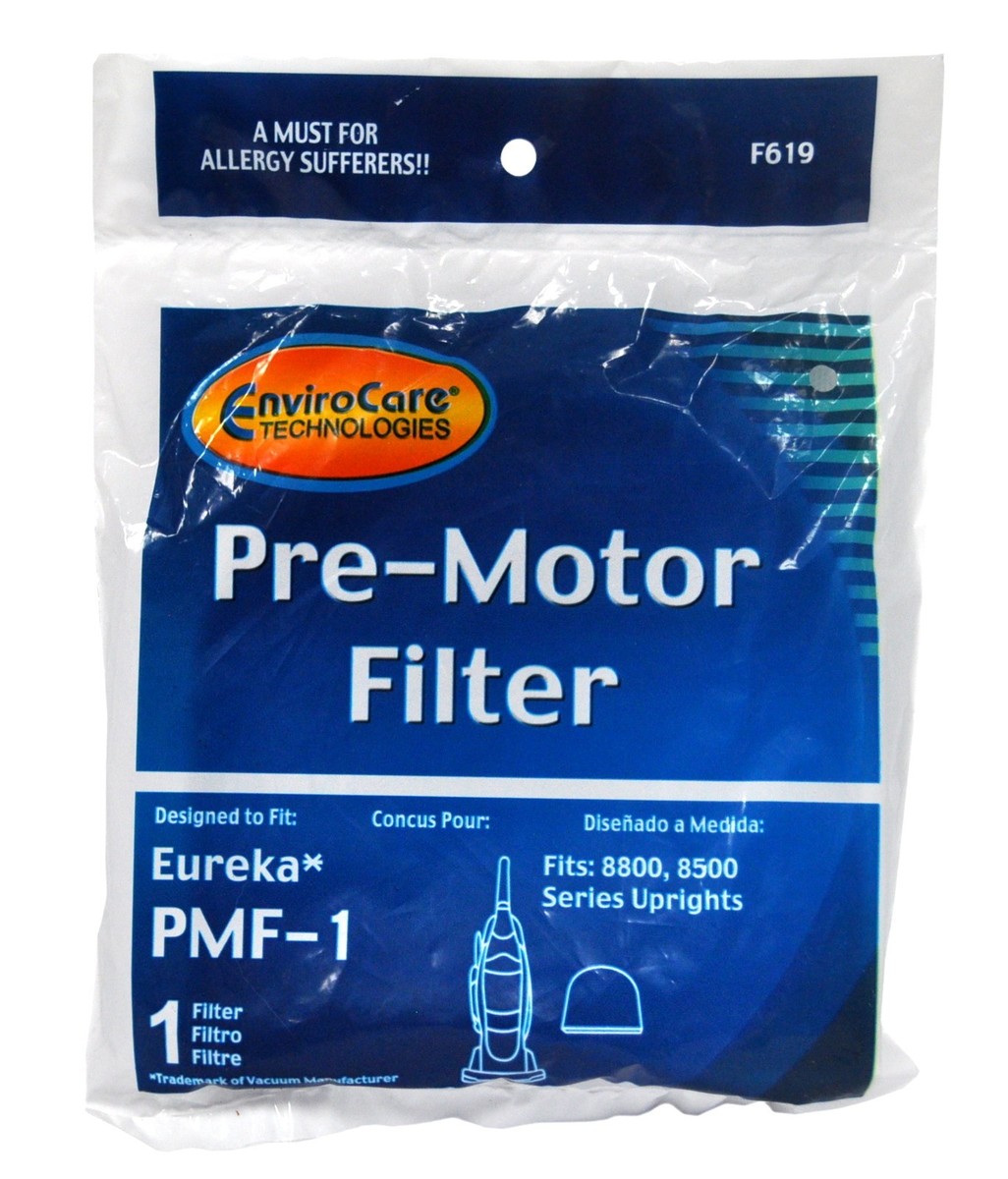 Envirocare Pre Motor Filter Designed To Fit Eureka PMF-1 Upright Vacuums F619. Designed to fit: Eureka Type PMF-1 Vacuums. Fits: 8800, 8500 Series Uprights. 1 Filter in package. Manufacturer Part Number: F619. ER-1829 SC-20-2332-01