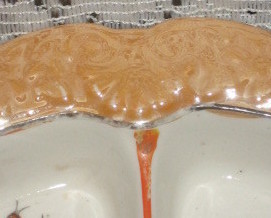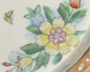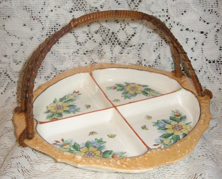 Hand painted, this divided relish dish displays delicate floral stems and butterflies. Design is repeated in each section. Peach tone edge has a lusterware finish with geometric and shell design. Original woven wicker handle is secure and strong. There are no cracks, chips or repairs. A few faint spots of wear can be found within divided sections. Measures 9" diam x 5.5" to top of handle.