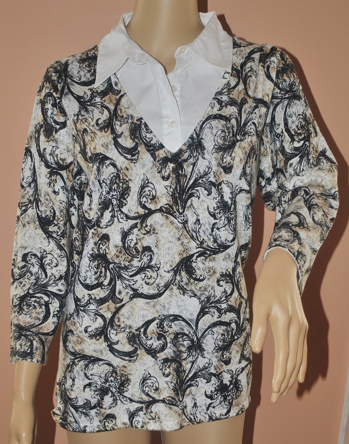 Mock layered, 3/4 length sleeve sweater with a white, button down, faux shirt showing at the V neck