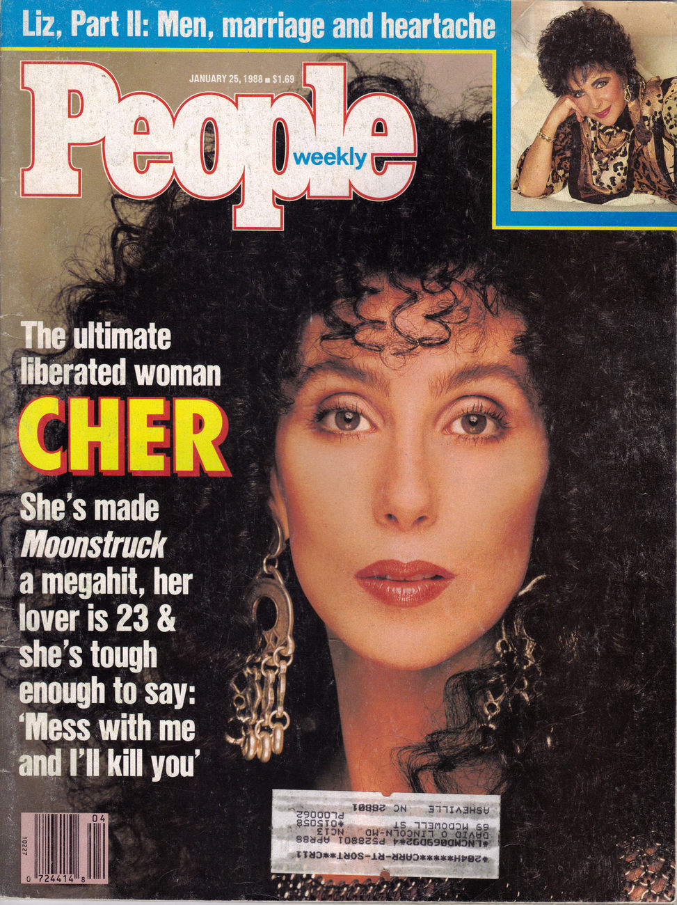 This is the January 25, 1988 issue of People Weekly Magazine featuring cover story, The Ultimate Liberated Woman, CHER. This issue contains a Bonus Book: excerpts from ELIZABETH TAYLOR's Elizabeth Takes Off, where she writes poignantly of her Hollywood girlhood, husbands, lovers and heartbreak entitled THE PASSIONATE YEARS.