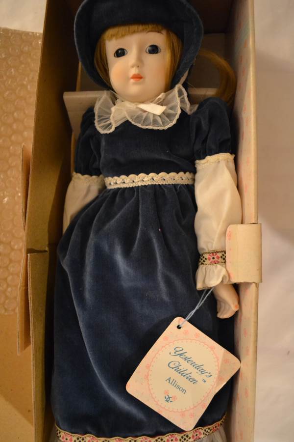 Collectible Like New. 14" Yesterday's Child Allison Porcelain Doll. Includes: Doll with hang tag and original box. Came from a private collection and was displayed in a doll case-also from a smoke pet free home. Ships with tracking and packed with care. G