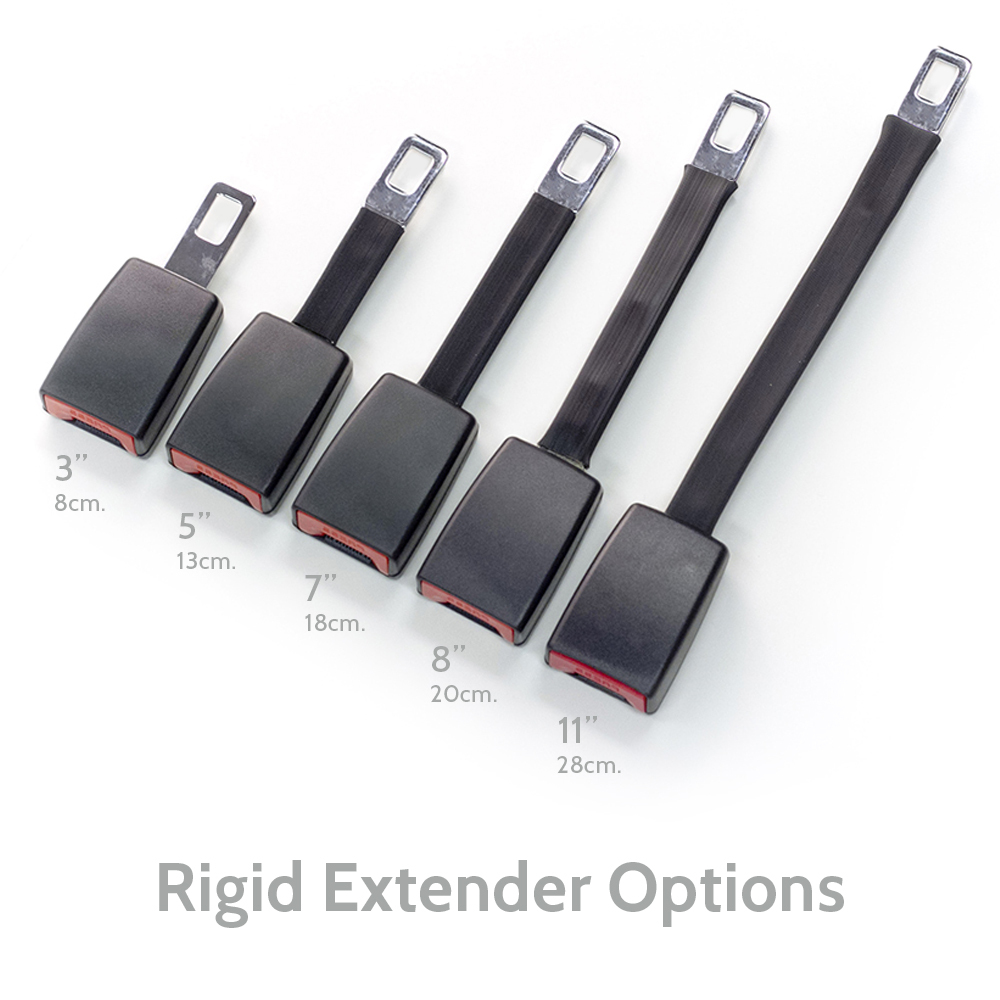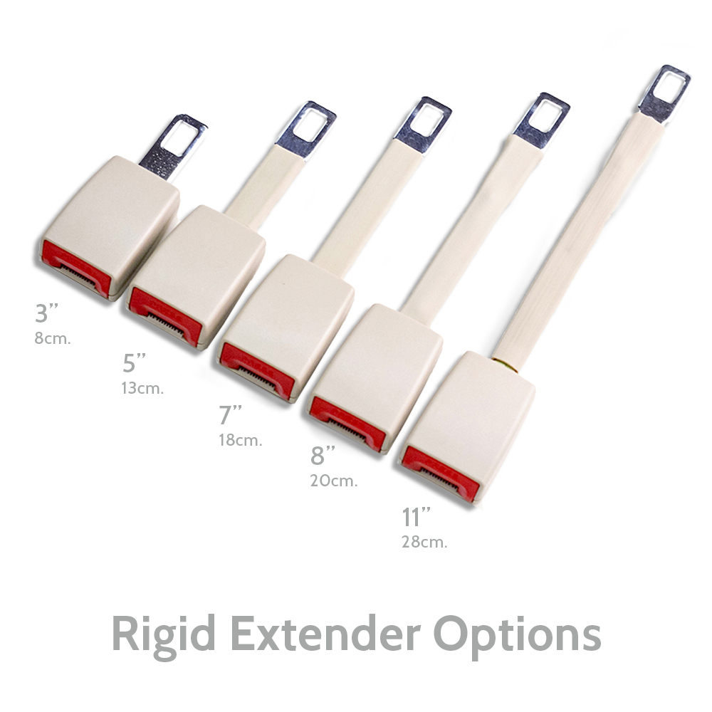 Mini Extenders: about 3 inches (8 cms) added to the vehicle's seat belt by clipping into the existing seat belt receptacle.