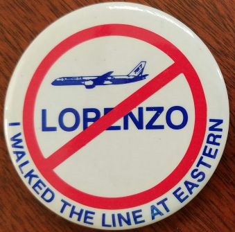 A vintage Anti Frank Lorenzo pin back button for Eastern Airlines: I walked the Line at Eastern.
