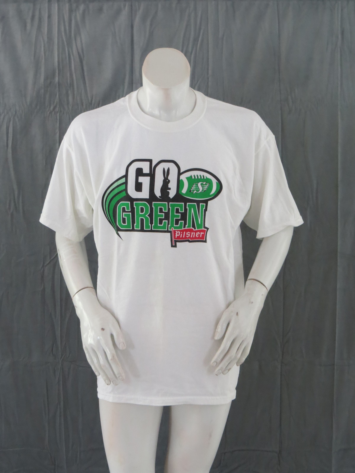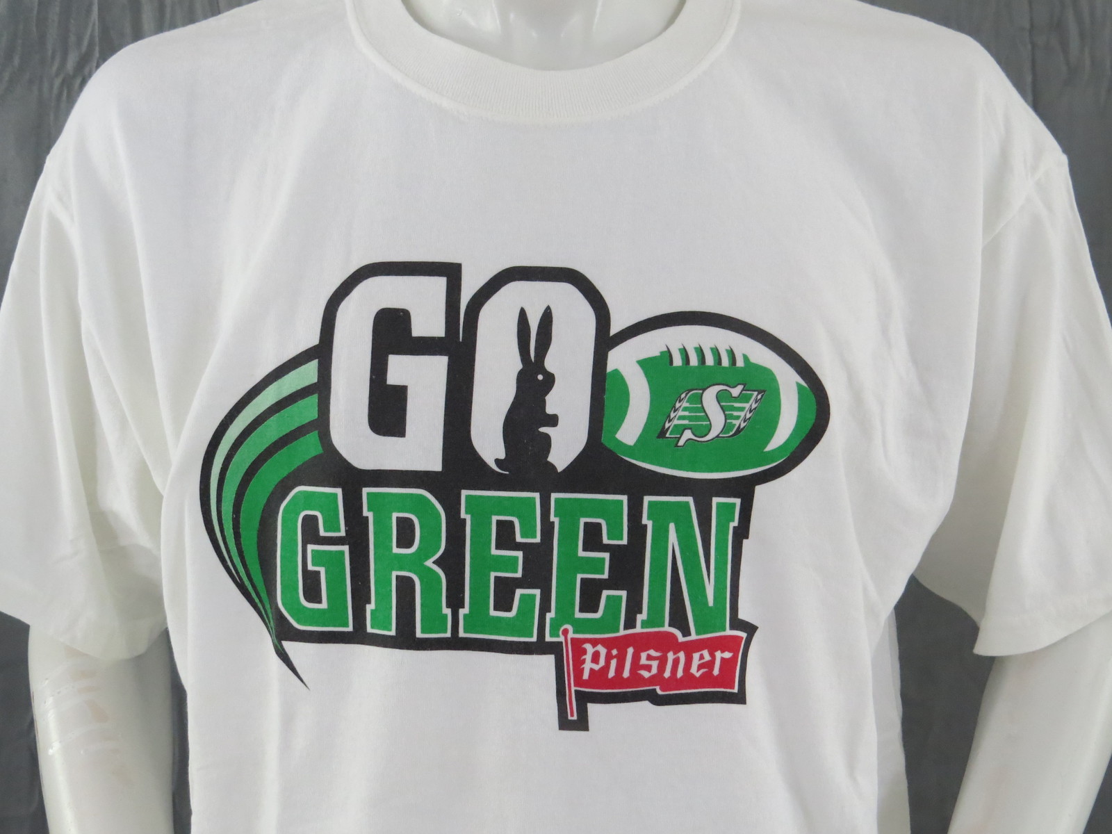 Up for sale is a Old Style Pilsner shirt. This is a cross promotional shirt in conjunction with the Saskatchewan Roughriders. The base colour of the shirt is white which really makes the predominantly white graphic pop. The graphic states go green with the Pil rabbit in the O and the pilsner flag underneath. There is a green football with the Roughrider logo in it. What a perfect piece for watching games in.