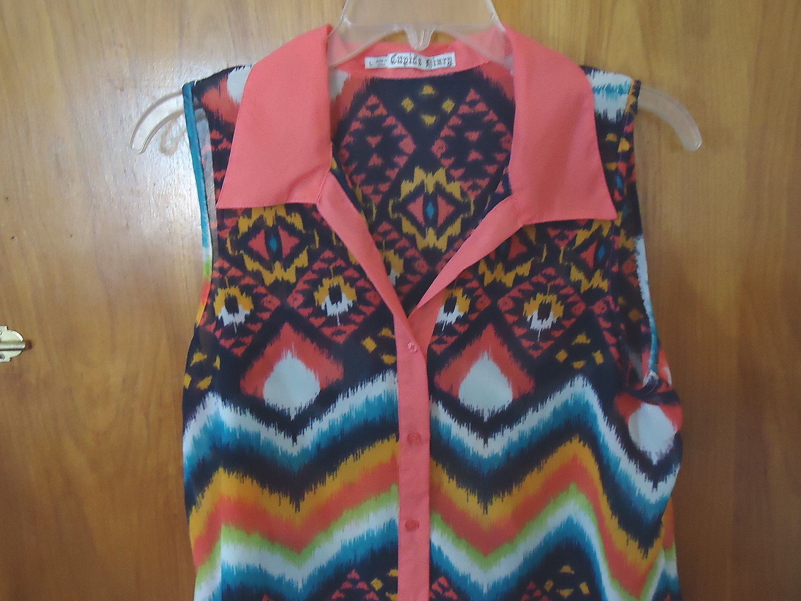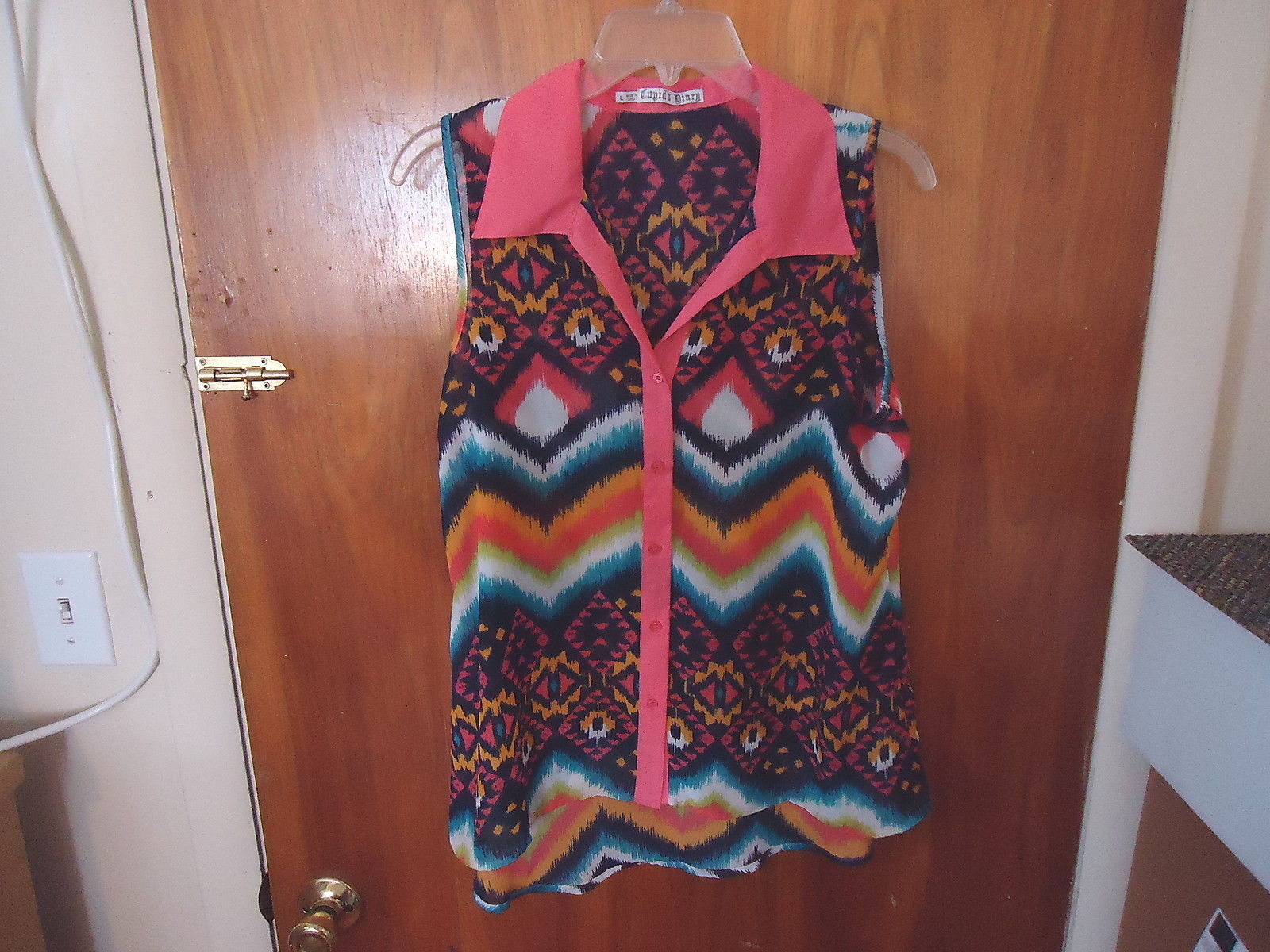 Here is a Womens Cupids Diary Size L Multi Color Button Down Sleeveless Top " BEAUTIFUL TOP ".The pics do not do this item(s) justice.If you have any concerns or questions about this item(s) please ask before bidding / purchasing this item(s).Thank You.-(CL15)
