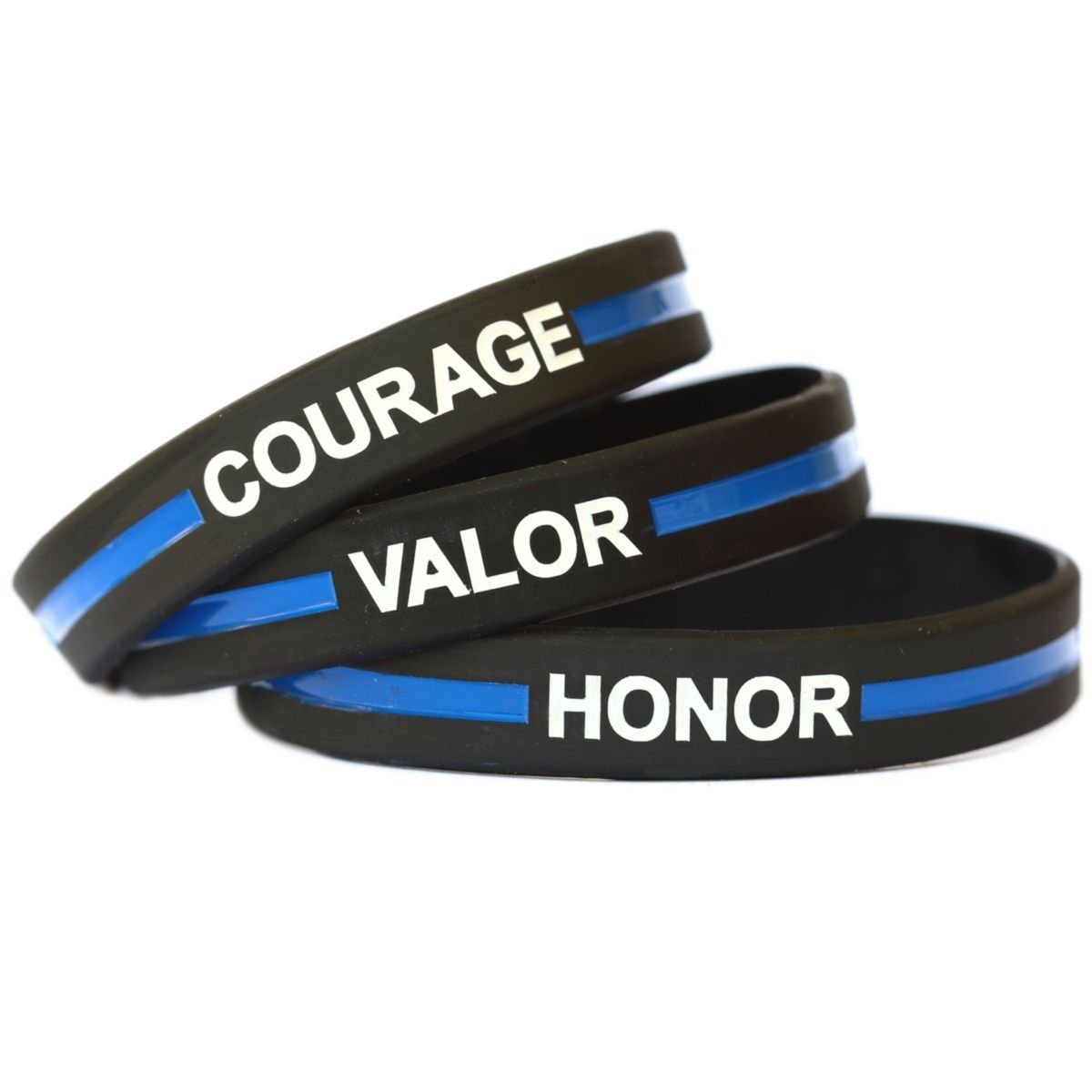 Courage Valor Honor message on high quality thin blue line silicone wristbands. The message on these bands is clear and bold. The text on these wristbands is debossed and color filled using a two-step process. Using a custom mold we first create bands with indented text and/or images for you. Then we paint fill those locations so your custom design is recessed below the top of the bands. The result is a better looking and much longer lasting wristband (compared to screen printed and other types of color text bands).