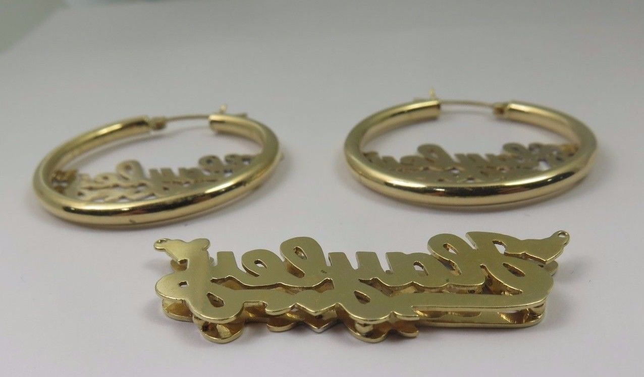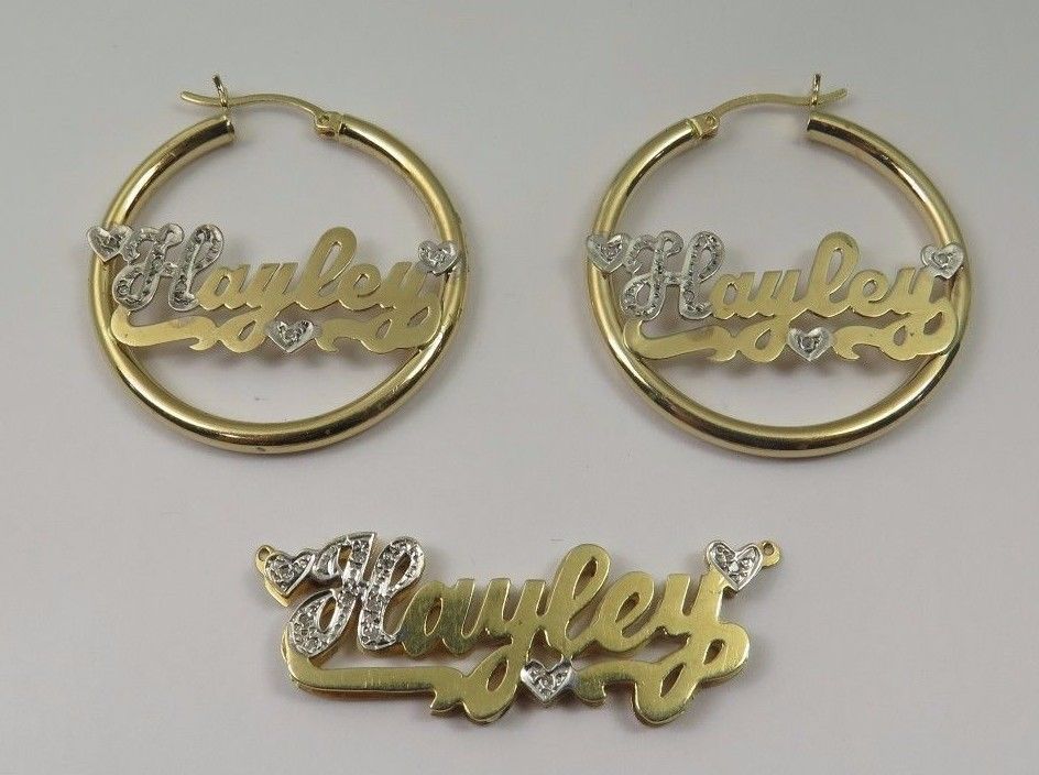 Here we have a beautiful 14k Two Tone Gold Hayley Name Plate Pendant With Hoop Earrings Set With Diamonds. Total weight: 12.4g. Pendant length: 1.75 inch. Width: 1/2 inch. Thickness: 2.8mm. Double plated. Earrings: 1.25" x 1.25" inch. Width: 3mm. The perfect gift for your loved one. Comes with a free gift box. Item is pre-owned and will show normal wear, but in great shape. Buy with confidence, we only sell top quality items. Thanks for looking and have a great day. Selling as a set only.